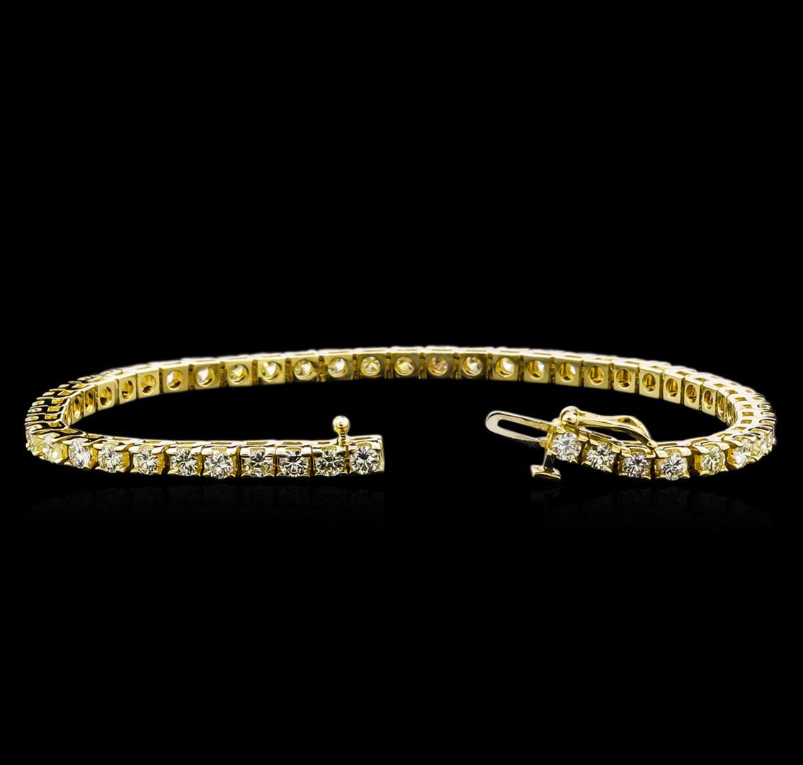 One electronically tested 14KT yellow gold ladies cast & assembled diamond tennis bracelet with a bright polish finish. Six and three-quarter inch length bracelet composed of a flexible ribbon of diamonds, terminating in a concealed clasp with safety. Identified with markings of "14K". Trademark is B&B. Condition is new, good workmanship. Tennis bracelets & necklaces got their unusual name from an incident involving the U.S. professional tennis player Chris Evert during a tennis match in the 1980's. Evert had been wearing an expensive diamond bracelet, an inline string of individually-set diamonds. Previously these bracelets were known as eternity bracelets. When the clasp snapped during play, she asked the officials to stop the tennis match until the bracelet could be found. Since that day, bracelets and necklaces featuring an inline string of diamonds have been called tennis bracelets and tennis necklaces. Containing: Fifty prong set round brilliant cut diamonds, measuring 2.80 - 2.70 x 1.65mm (depth est.) approximate total weight of 50 Stones = 4.00ct. The color grade reflects the entire range of color for this group. Graded in the setting. Clarity: VS-2 to SI-2. Color: H - K. Total Weight of Diamonds 4.00ct. Total Weight of Bracelet 11.19gm. AIG Appraised at $13,665.00.