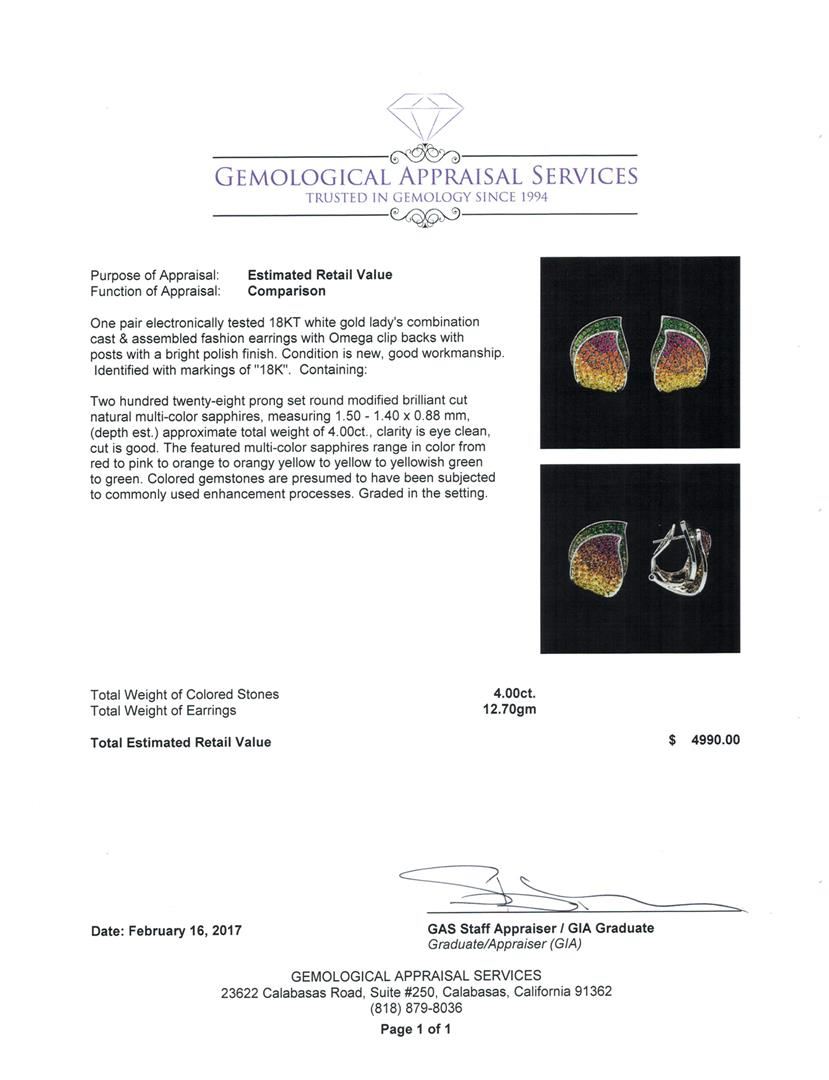One pair electronically tested 18KT white gold lady's combination cast & assembled fashion earrings with Omega clip backs with posts with a bright polish finish. Identified with markings of '18K'. Condition is new, good workmanship. Containing: Two hundred twenty-eight prong set round modified brilliant cut natural multi-color sapphires, measuring 1.50 - 1.40 x 0.88 mm, (depth est.) approximate total weight of 4.00ct., clarity is eye clean, cut is good. The featured multi-color sapphires range in color from red to pink to orange to orangy yellow to yellow to yellowish green to green. Colored gemstones are presumed to have been subjected to commonly used enhancement processes. Graded in the setting. Total Weight of Colored Stones 4.00ct.. Total Weight of Earrings 12.70gm. GAS Appraised at $4,990.00.