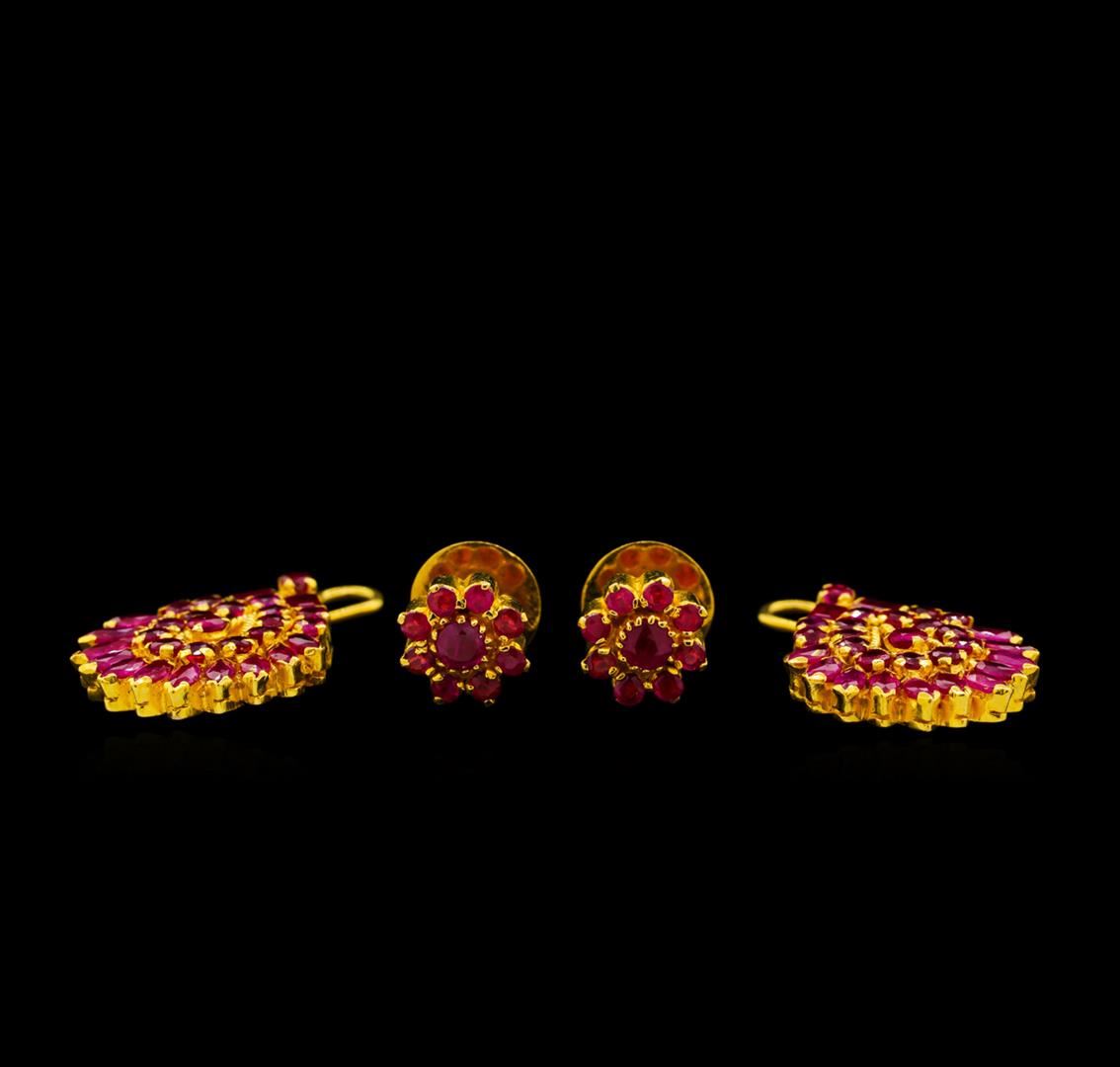 One pair of 22KT yellow gold earrings weighing 12.8 grams containing rubies with SI clarity and medium to dark tone weighing 4.00ctw. GGA Appraised at $5,560.00.