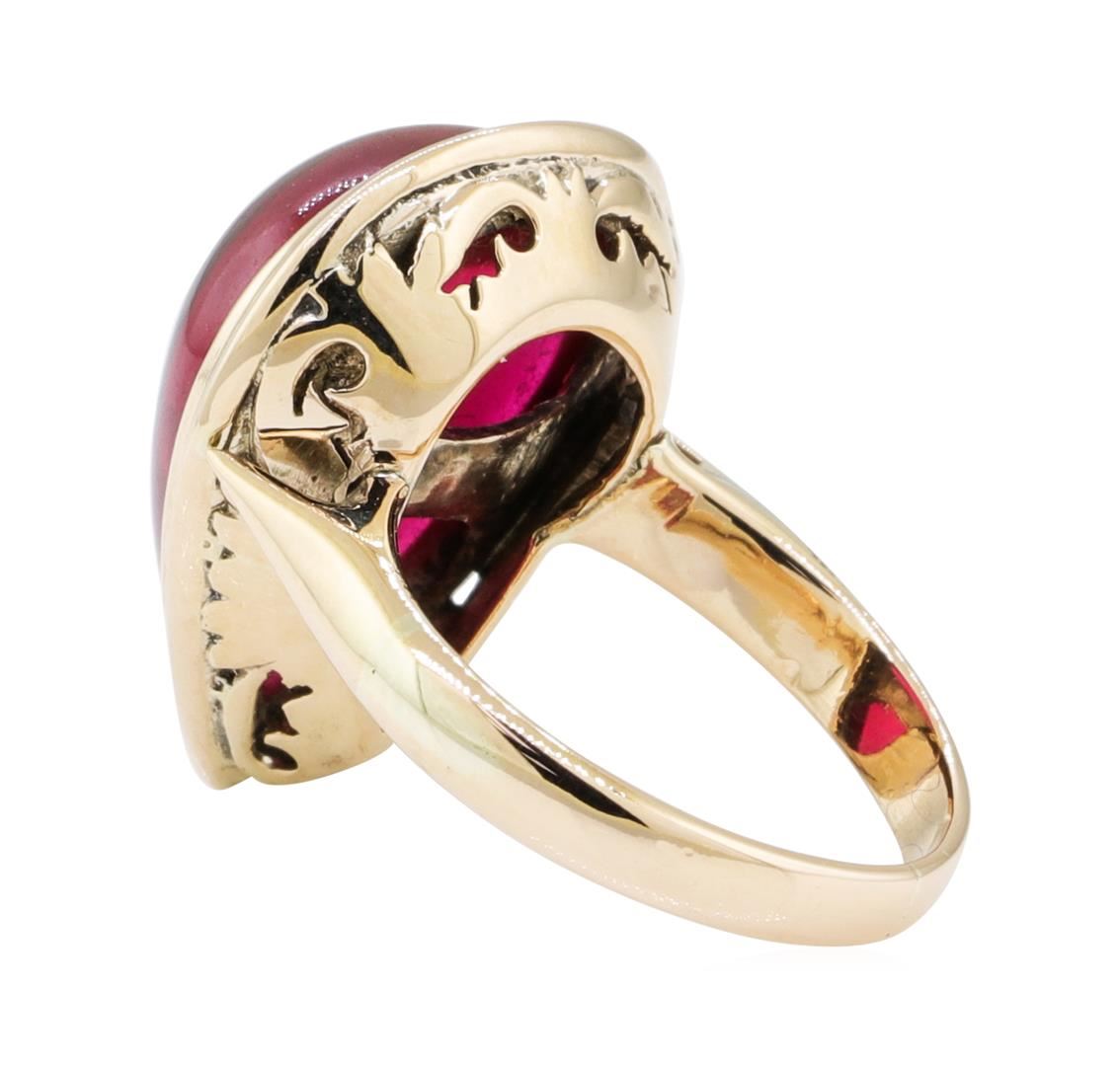 One ring featuring: 10KT yellow gold weighing 5.6 grams containing one cabochon pear shape synthetic ruby weighing 5.00ct.