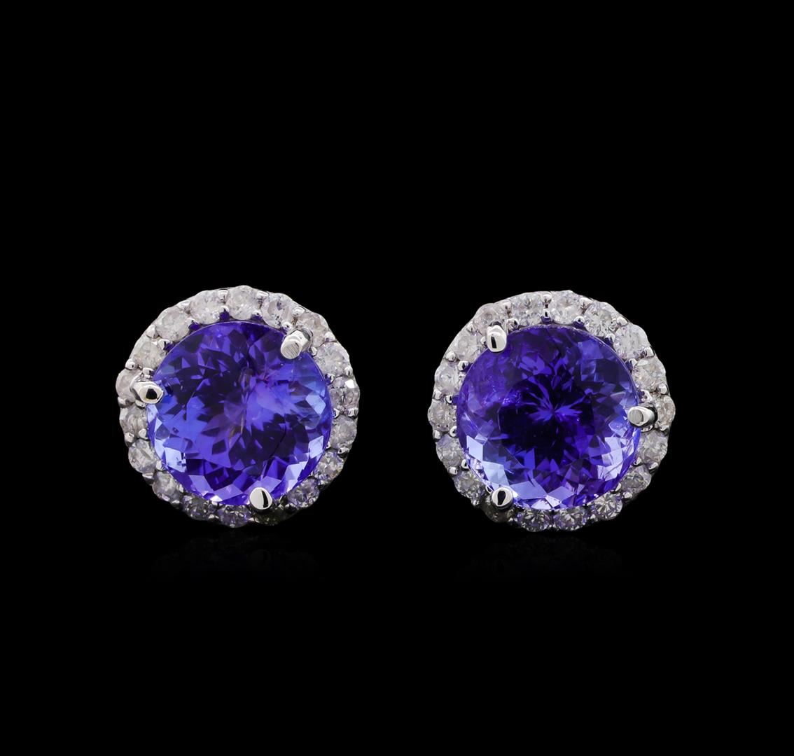 One pair electronically tested 14KT white gold cast tanzanite and diamond earrings with screw backs. Each earring features a tanzanite set within a diamond bezel. Bright polish finish. Trademark is Orianne. Identified with markings of "14K". Condition is new, good workmanship. Containing: Two prong set round brilliant cut natural tanzanites approximate total weight of 4.00ct., clarity is slightly included, type I, medium dark, very slightly grayish, violetish blue color, (GIA vB 6/3), cut is good. Transmitting light with a minimum of distortion, transparent. Naturally occurring internal & external characteristics are present. Color graded is an average for the pair. Graded in the setting. Tanzanite is a very rare gemstone that is only found in the country of Tanzania. Originally discovered in 1967. Tiffany & Company, named the stone Tanzanite. It is found in the Usumburu Mountains that border the Umba Valley of northern Tanzania. Tanzanite occurs in gray, brown, violet, blue, reddish-purple, & green. The gem is interesting because of its exceptional pleochroism. Rotated in different directions a tanzanite will exhibit multiple changes of color. Tanzanite has a low tolerance to ultrasonic cleaning, and should not be cleaned using this method. Thirty-Six prong set round brilliant cut diamonds approximate total weight of 36 Stones = 0.41ct. Graded in the setting. Clarity: I-1 to I-2. Color: G - I. Total Weight of Colored Stones 4.00ct. Total Weight of Diamonds 0.41ct. Total Weight of Earrings 2.56gm. AIG Appraised at $8,630.00.