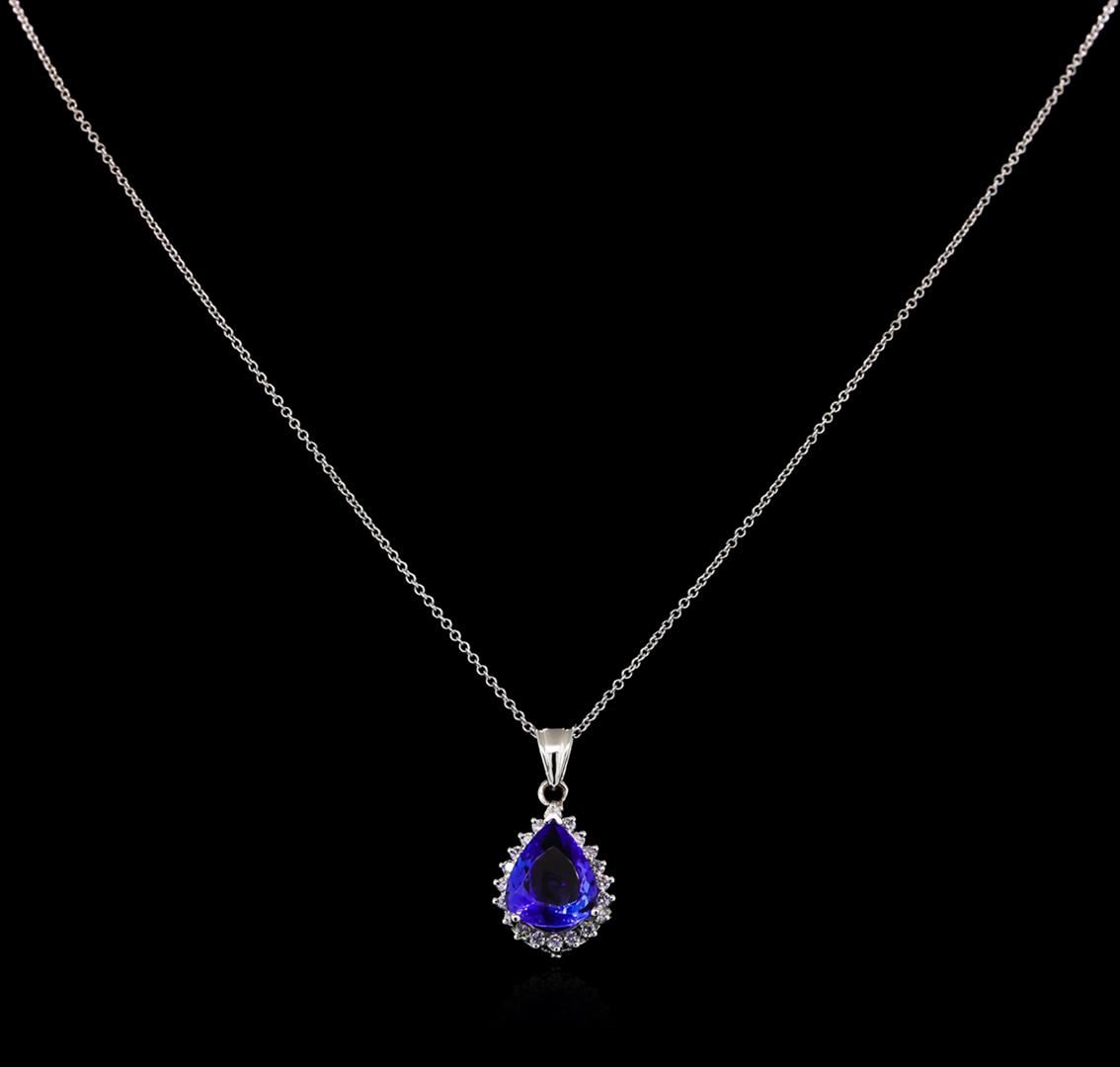 One electronically tested 14KT white gold lady's combination cast & assembled fashion pendant & chain 18.0" long, 1.2mm round cable link with a lobster claw clasp with a bright polish finish. Identified with markings of "14K". Condition is new, good workmanship. Containing: One prong set pear modified brilliant cut natural tanzanite, measuring 11.80 x 10.09 x 5.41mm, approximate weight of 4.00ct., clarity is eye clean, type I, medium dark, moderately strong, violetish blue color, (GIA vB 6/4), cut is good. Transmitting light with no distortion, transparent. Colored gemstones are presumed to have been subjected to commonly used enhancement processes. Graded in the setting. Twenty prong set round brilliant cut diamonds, measuring 1.85 - 1.75 x 1.12mm (depth est.) approximate total weight of 20 Stones = 0.45ct. Graded in the setting. Clarity: SI-1 to SI-2. Color: H - I. Cut Very Good. Total Weight of Colored Stones 4.00ct. Total Weight of Diamonds 0.45ct. Total Weight of Pendant & Chain 5.50gm GAS Appraised.