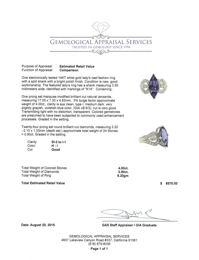 One electronically tested 14KT white gold lady's cast fashion ring with a split shank with a bright polish finish. The featured lady's ring has a shank measuring 3.50 millimeters wide. Identified with markings of "K14". Condition is new, good workmanship. Containing: One prong set marquise modified brilliant cut natural tanzanite, measuring 17.00 x 7.30 x 4.83mm, 5% bulge factor, approximate weight of 4.00ct., clarity is eye clean, type I, medium dark, very slightly grayish, violetish blue color, (GIA vB 6/3), cut is very good. Transmitting light with no distortion, transparent. Colored gemstones are presumed to have been subjected to commonly used enhancement processes. Graded in the setting. Twenty-Four prong set round brilliant cut diamonds, measuring 2.20 - 2.10 x 1.33mm (depth est.) approximate total weight of 24 Stones = 0.90ct. Graded in the setting. Clarity: SI-2 to I-1. Color: H - I. Cut Good. Total Weight of Colored Stones 4.00ct. Total Weight of Diamonds 0.90ct. Total Weight of Ring 8.20gm. GAS Appraised at $8,575.00.