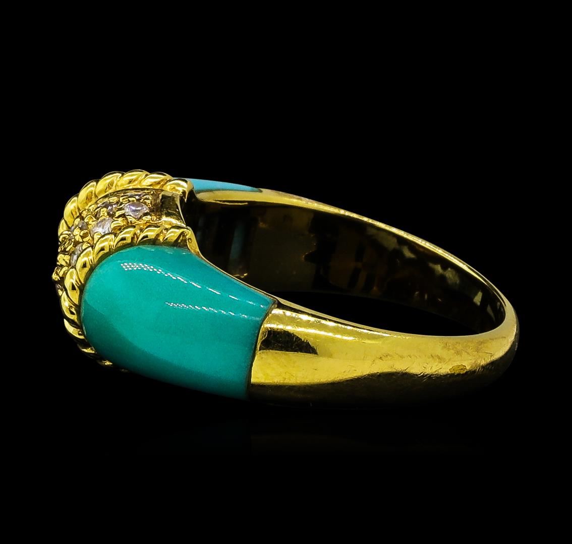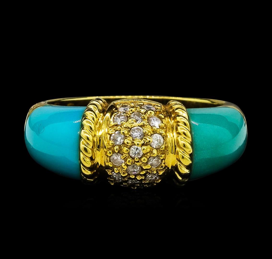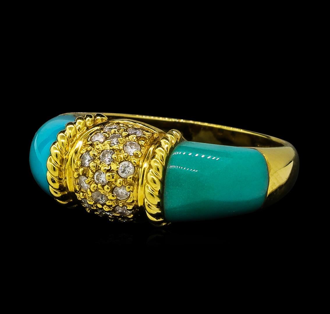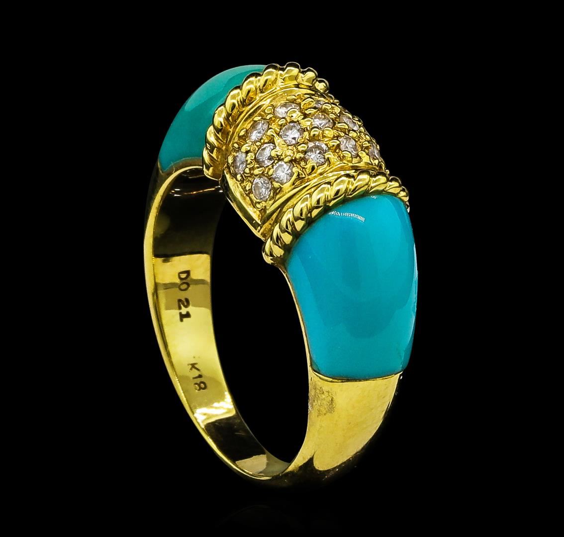 One electronically tested 18KT yellow gold ladies cast turquoise and diamond ring. The ring features a center diamond curved gallery set between tapering turquoise shoulders, completed by a two and one-half millimeter wide band. Bright and patterned finish with rope detailing. Identified with markings of 'K18'. Condition is good. Containing: Two prong set free-form cabochon cut natural turquoises approximate total weight of 4.00ct., medium, very slightly grayish, very strongly greenish blue color, (GIA vstgB 5/3), cut is good. Transmitting light very diffusely, opaque. Naturally occurring internal & external characteristics are present. Color grade is an average for the pair. Graded in the setting. Turquoise is commonly impregnated to improve the color and texture. Evidence that may confirm this is typically lacking. Seventeen prong set round brilliant cut diamonds, measuring 1.40 - 1.40 x 0.84mm (depth est.) approximate total weight of 17 Stones = 0.21ct. Graded in the setting. Clarity SI-2 to I-2. Color: F - H. Total Weight of Colored Stones 4.00ct.. Total Weight of Diamonds 0.21ct.. Total Weight of Ring 5.77gm. AIG Appraised at $2,090.00.