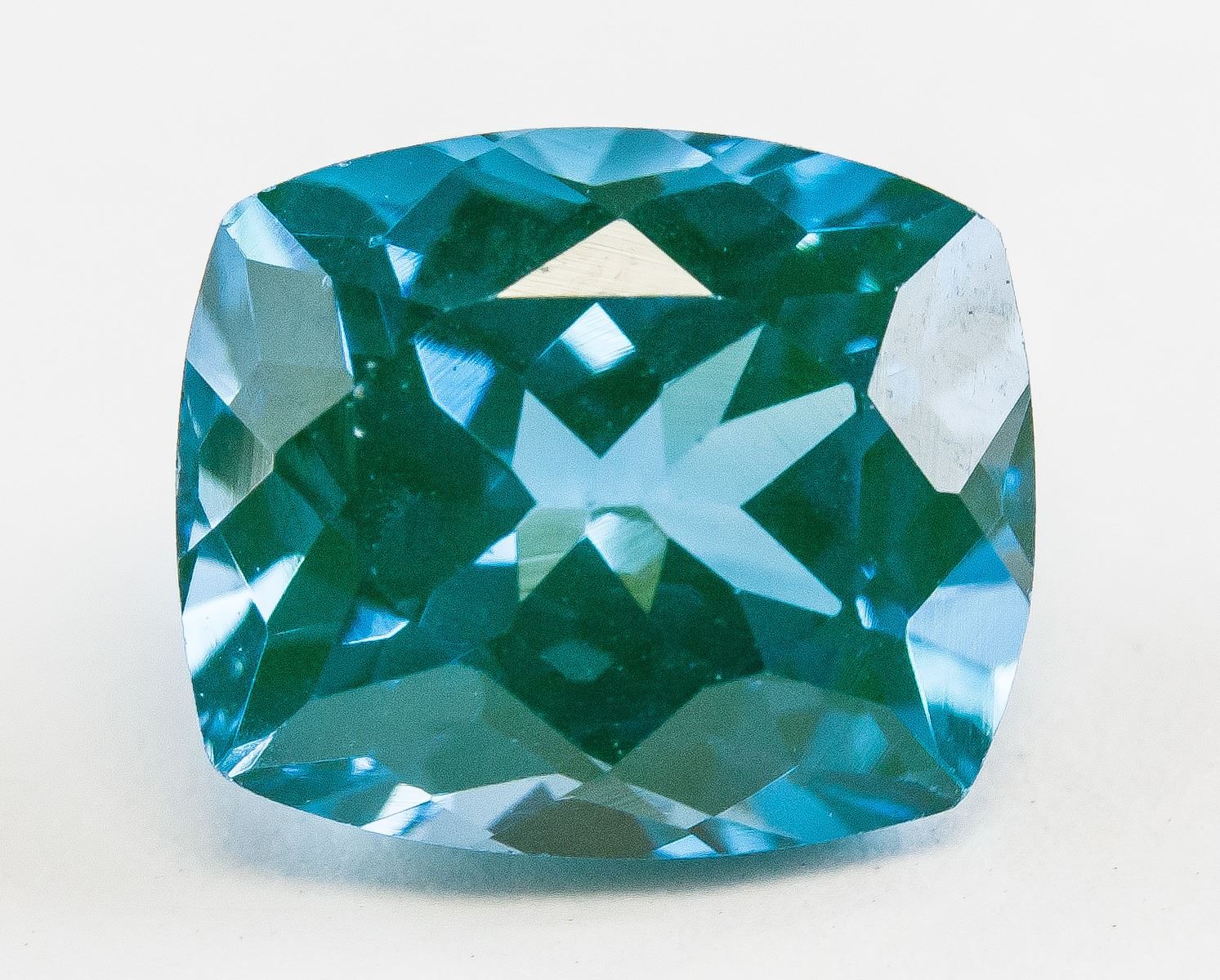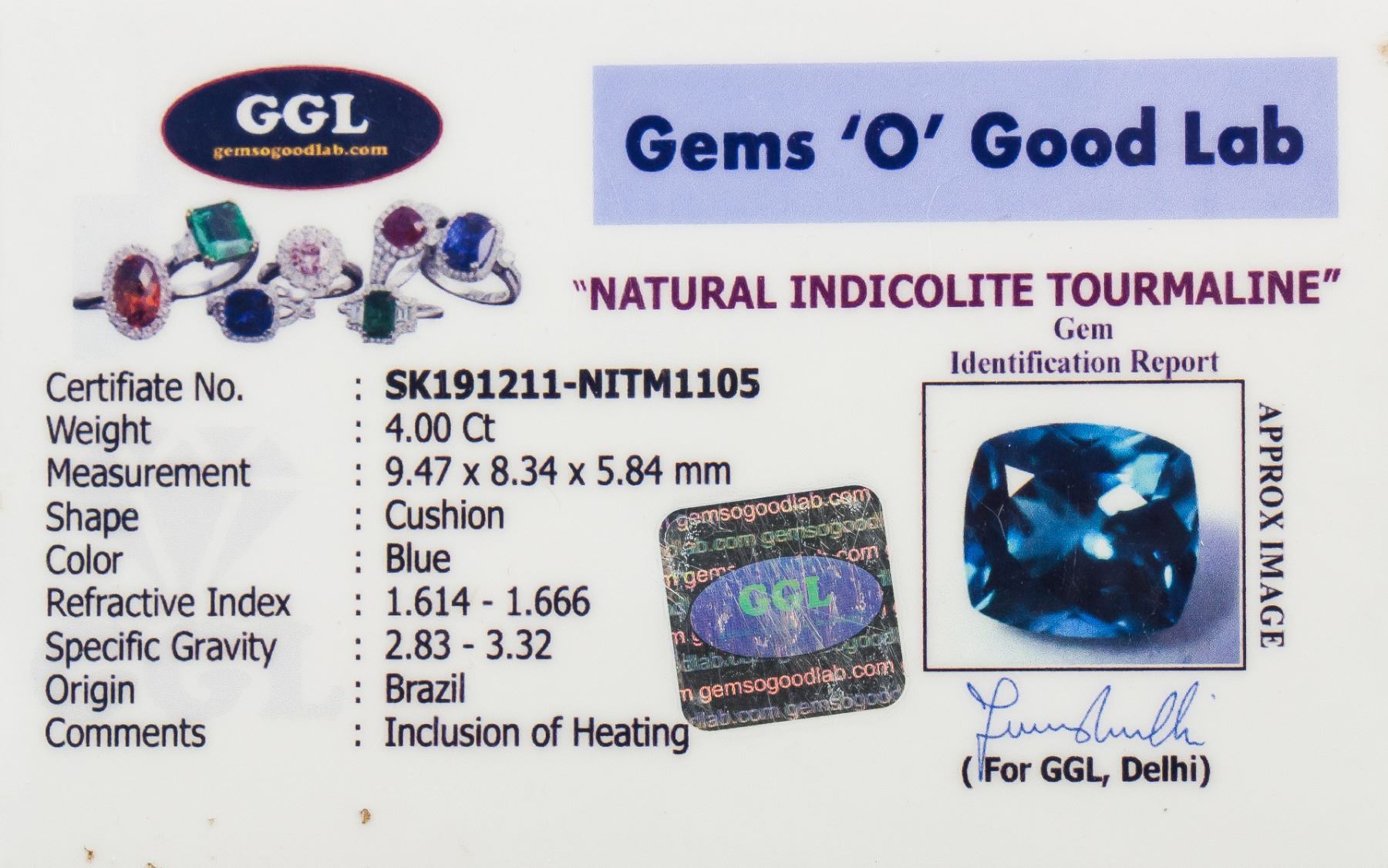 One (1) 4.00 ct cushion cut blue indicolite tourmaline gemstone. 9.47 x 8.34 x 5.84 mm. Accompanied with GGL certificate.
