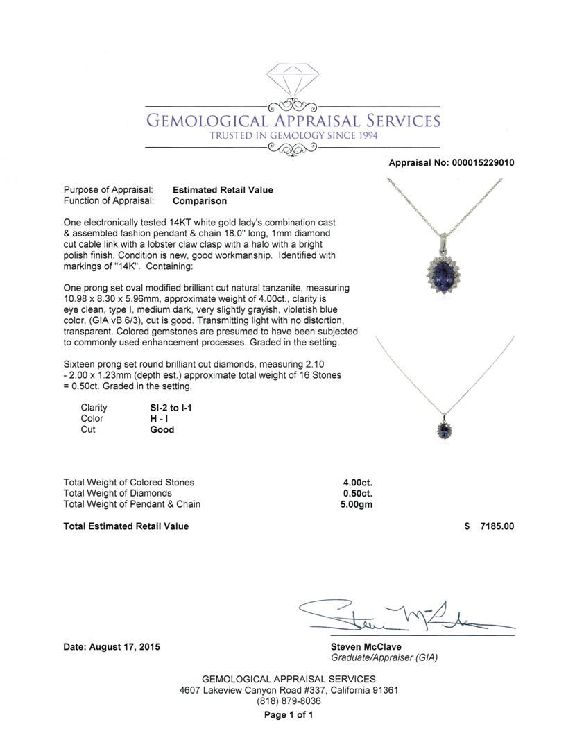 One electronically tested 14KT white gold lady's combination cast & assembled fashion pendant & chain 18.0" long, 1mm diamond cut cable link with a lobster claw clasp with a halo with a bright polish finish. Identified with markings of "14K". Condition is new, good workmanship. Containing: One prong set oval modified brilliant cut natural tanzanite, measuring 10.98 x 8.30 x 5.96mm, approximate weight of 4.00ct., clarity is eye clean, type I, medium dark, very slightly grayish, violetish blue color, (GIA vB 6/3), cut is good. Transmitting light with no distortion, transparent. Colored gemstones are presumed to have been subjected to commonly used enhancement processes. Graded in the setting. Sixteen prong set round brilliant cut diamonds, measuring 2.10 - 2.00 x 1.23mm (depth est.) approximate total weight of 16 Stones = 0.50ct. Graded in the setting. Clarity: SI-2 to I-1. Color: H - I. Cut Good. Total Weight of Colored Stones 4.00ct. Total Weight of Diamonds 0.50ct. Total Weight of Pendant & Chain 5.00gm. GAS Appraised at $7,185.00.