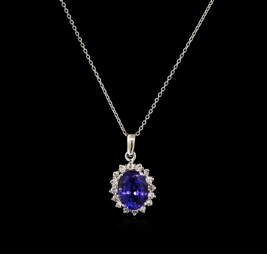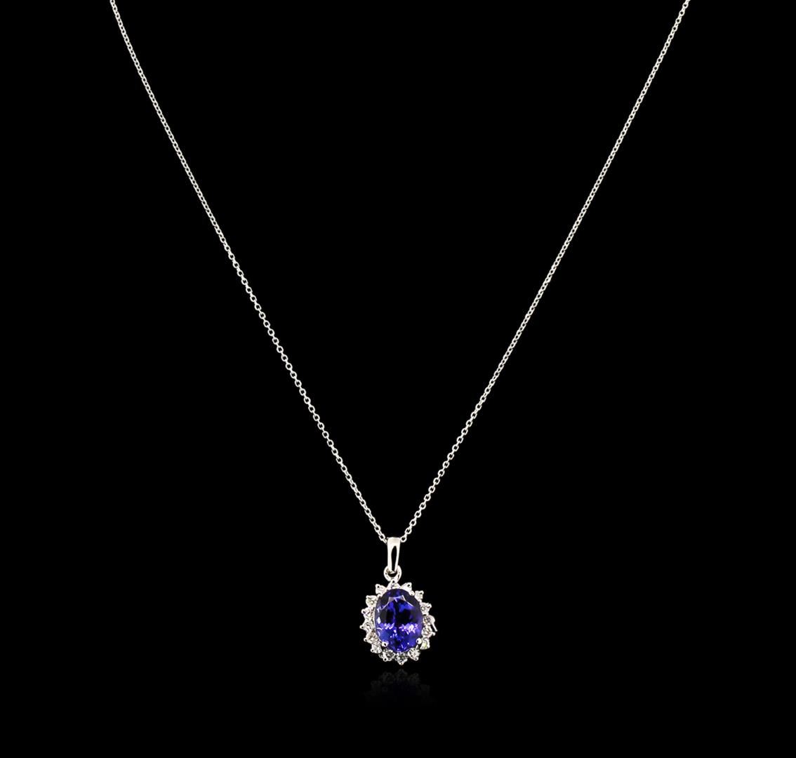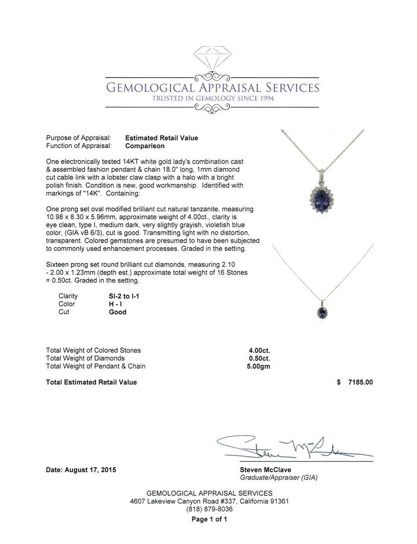 One electronically tested 14KT white gold lady's combination cast & assembled fashion pendant & chain 18.0" long, 1mm diamond cut cable link with a lobster claw clasp with a halo with a bright polish finish. Identified with markings of "14K". Condition is new, good workmanship. Containing: One prong set oval modified brilliant cut natural tanzanite, measuring 10.98 x 8.30 x 5.96mm, approximate weight of 4.00ct., clarity is eye clean, type I, medium dark, very slightly grayish, violetish blue color, (GIA vB 6/3), cut is good. Transmitting light with no distortion, transparent. Colored gemstones are presumed to have been subjected to commonly used enhancement processes. Graded in the setting. Sixteen prong set round brilliant cut diamonds, measuring 2.10 - 2.00 x 1.23mm (depth est.) approximate total weight of 16 Stones = 0.50ct. Graded in the setting. Clarity: SI-2 to I-1. Color: H - I. Cut Good. Total Weight of Colored Stones 4.00ct. Total Weight of Diamonds 0.50ct. Total Weight of Pendant & Chain 5.00gm. GAS Appraised at $7,185.00.