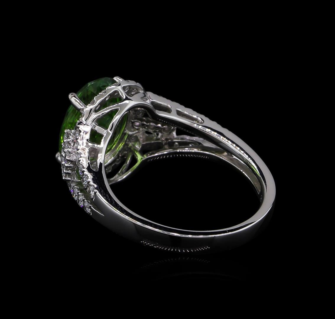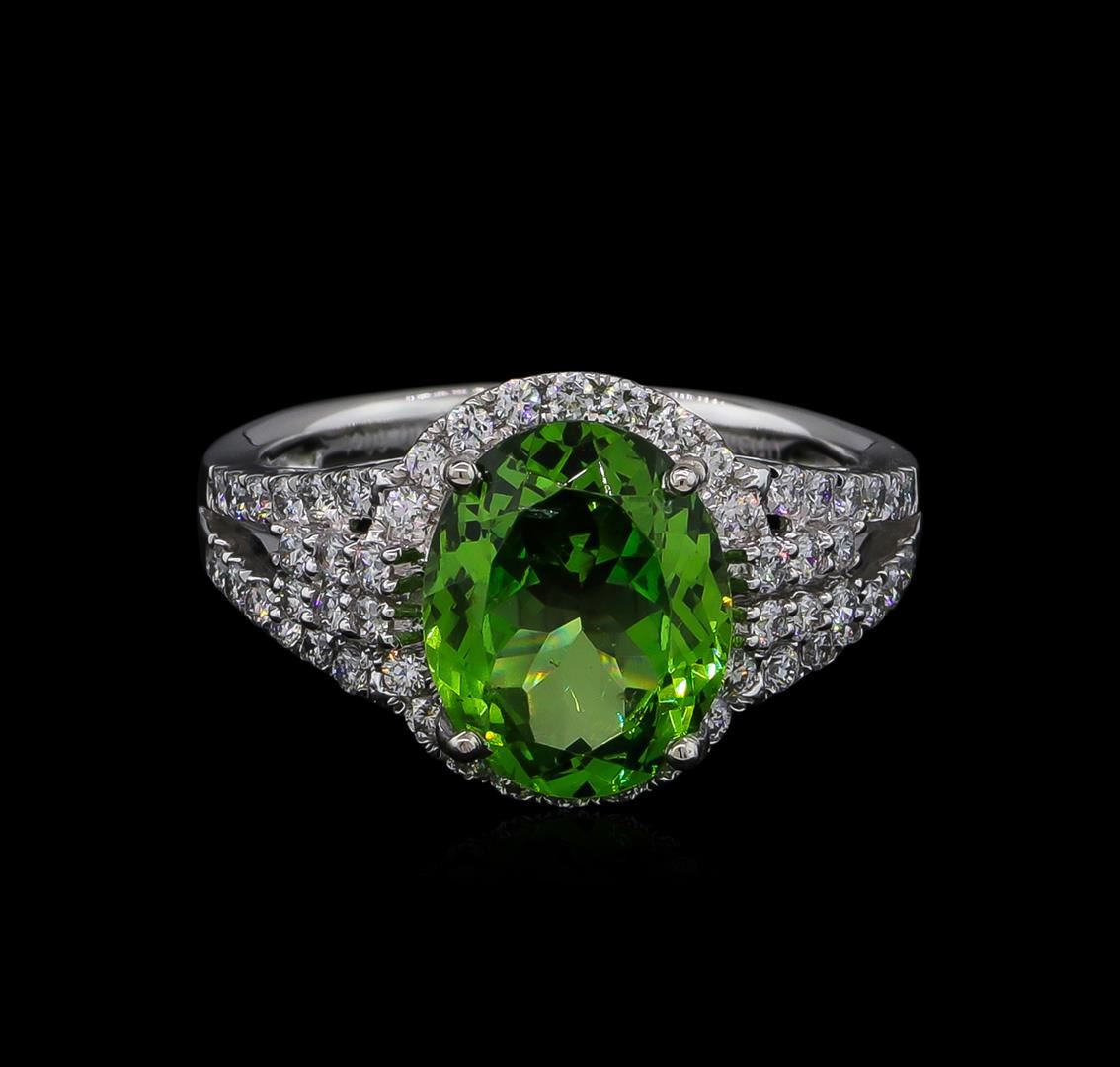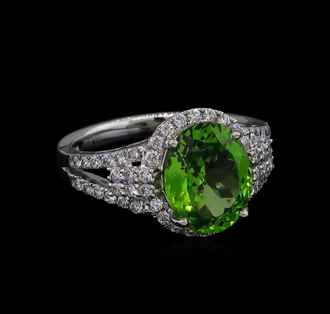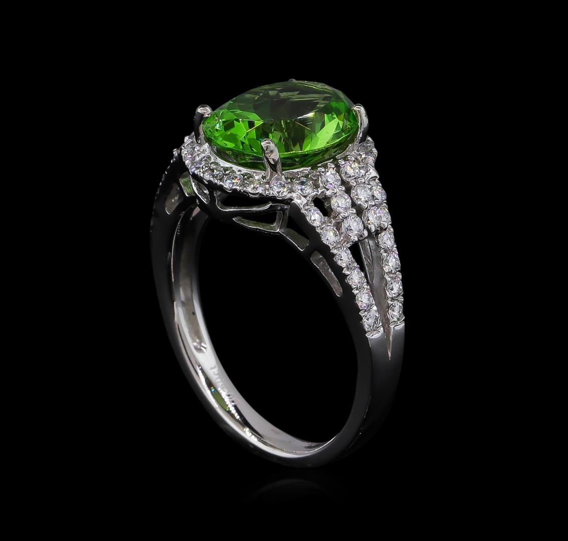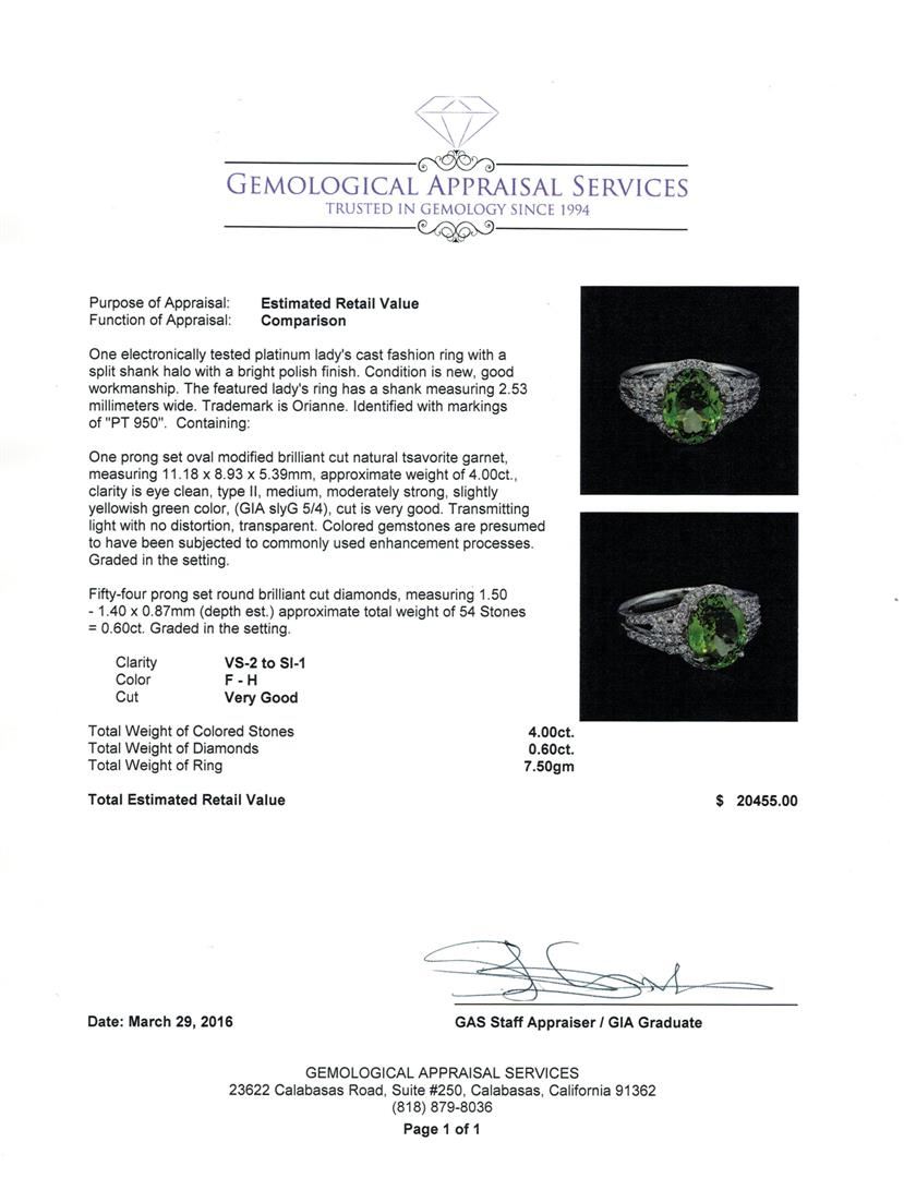 One electronically tested platinum lady's cast fashion ring with a split shank halo with a bright polish finish. The featured lady's ring has a shank measuring 2.53 millimeters wide. Trademark is Orianne. Identified with markings of "PT 950". Condition is new, good workmanship. Containing: One prong set oval modified brilliant cut natural tsavorite garnet, measuring 11.18 x 8.93 x 5.39mm, approximate weight of 4.00ct., clarity is eye clean, type II, medium, moderately strong, slightly yellowish green color, (GIA slyG 5/4), cut is very good. Transmitting light with no distortion, transparent. Colored gemstones are presumed to have been subjected to commonly used enhancement processes. Graded in the setting. Fifty-Four prong set round brilliant cut diamonds, measuring 1.50 - 1.40 x 0.87mm (depth est.) approximate total weight of 54 Stones = 0.60ct. Graded in the setting. Clarity: VS-2 to SI-1. Color: F - Very Good. Total Weight of Colored Stones 4.00ct. Total Weight of Diamonds 0.60ct. Total Weight of Ring 7.50gm. GAS Appraised at $20,455.00.