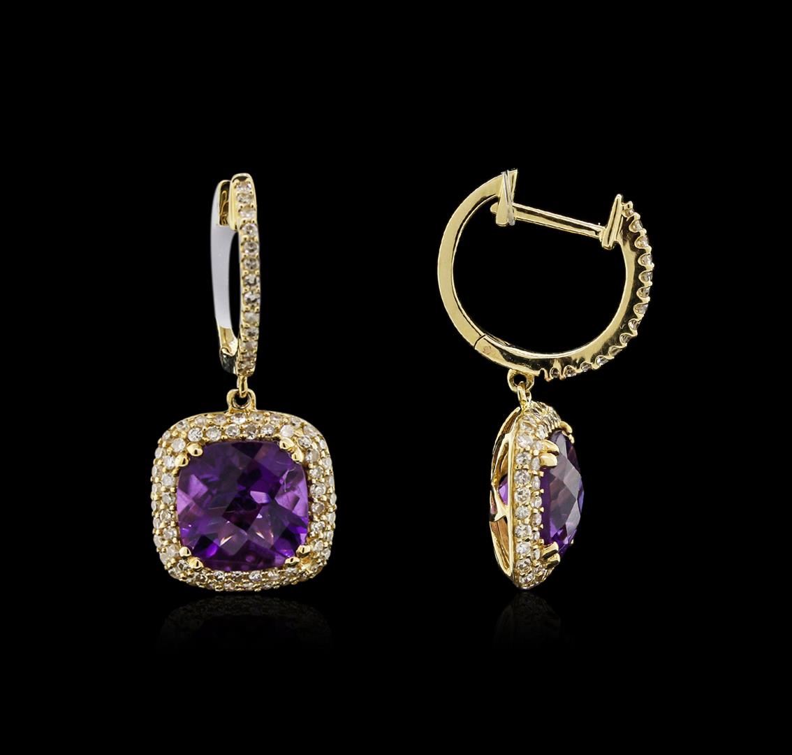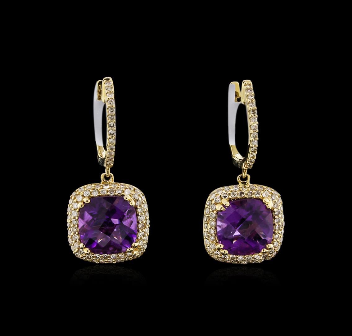 One pair of dangle earrings featuring: 14KT yellow gold weighing 3.70 grams containing amethysts with a total weight of 4.00ct and diamonds with a total weight of 0.47ct.