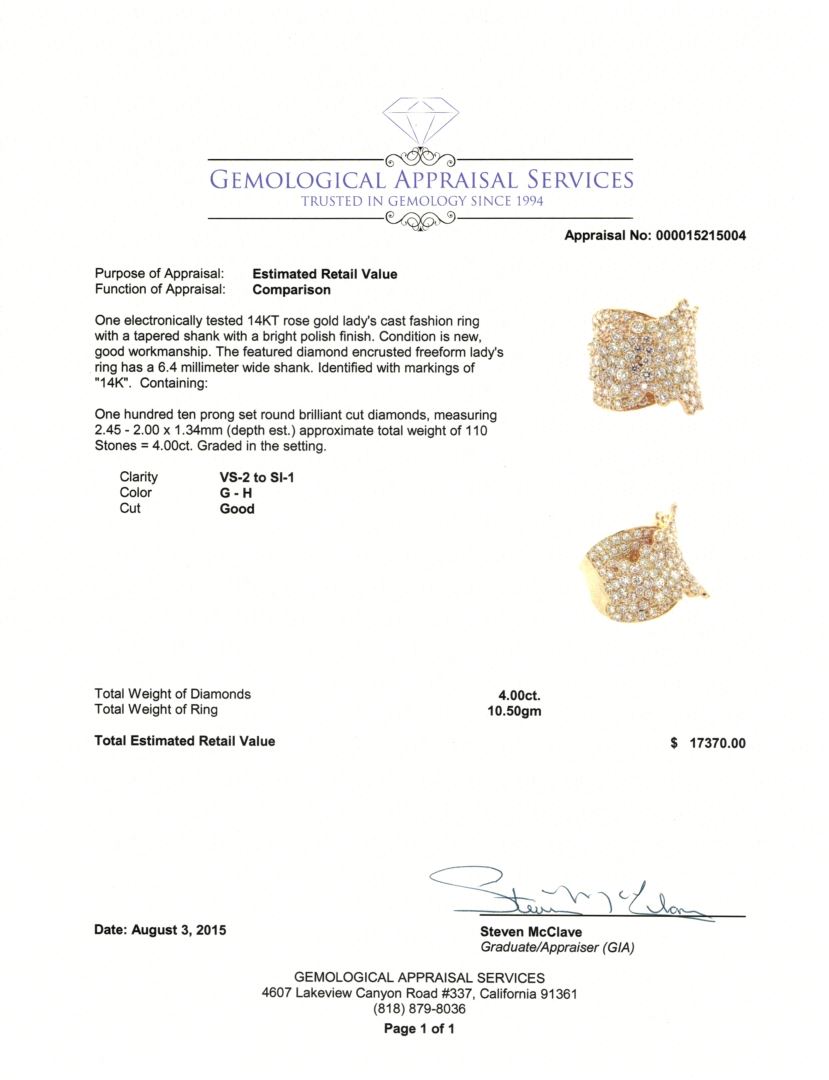One electronically tested 14KT rose gold lady's cast fashion ring with a tapered shank with a bright polish finish. The featured diamond encrusted freeform lady's ring has a 6.4 millimeter wide shank. Identified with markings of "14K". Condition is new, good workmanship. Containing: One Hundred Ten prong set round brilliant cut diamonds, measuring 2.45 - 2.00 x 1.34mm (depth est.) approximate total weight of 110 Stones = 4.00ct. Graded in the setting. Clarity VS-2 to SI-1 Color G - H. Cut Good Total Weight of Diamonds 4.00ct. Total Weight of Ring 10.50gm GAS Appraised at $17,370.00.