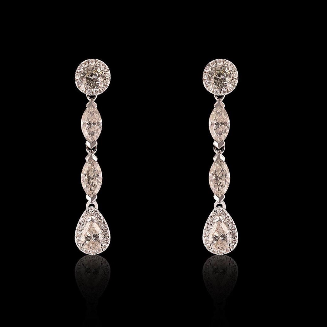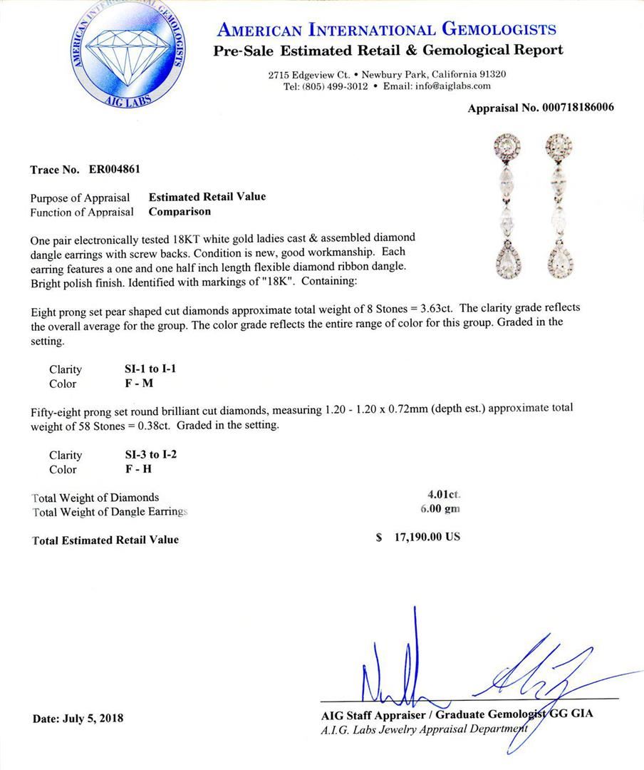 One pair electronically tested 18KT white gold ladies cast and assembled diamond dangle earrings with screw backs. Condition is new, good workmanship. Each earring features a one and one half inch length flexible diamond ribbon dangle. Bright polish finish. Identified with markings of "18K". Containing: Eight prong set pear shaped cut diamonds approximate total weight of 8 Stones = 3.63ct. The clarity grade reflects the overall average for the group. The color grade reflects the entire range of color for this group. Graded in the setting. Clarity SI-1 to I-1 Color F - M Fifty-eight prong set round brilliant cut diamonds, measuring 1.20 - 1.20 x 0.72mm (depth est.) approximate total weight of 58 Stones = 0.38ct. Graded in the setting. Clarity SI-3 to I-2 Color F - H Total Weight of Diamonds 4.01ct. Total Weight of Dangle Earrings 6.00 gm