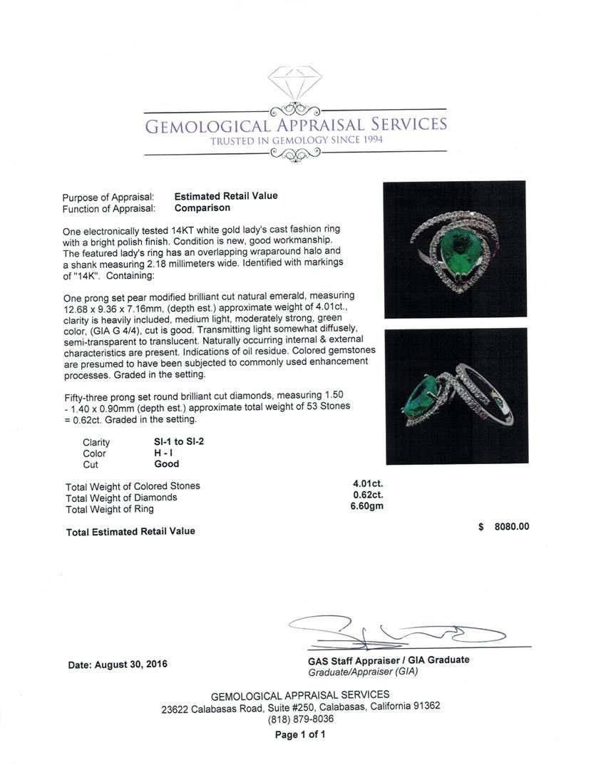 One electronically tested 14KT white gold lady's cast fashion ring with a bright polish finish. The featured lady's ring has an overlapping wraparound halo and a shank measuring 2.18 millimeters wide. Identified with markings of '14K'. Condition is new, good workmanship. Containing: One prong set pear modified brilliant cut natural emerald, measuring 12.68 x 9.36 x 7.16mm, (depth est.) approximate weight of 4.01ct., clarity is heavily included, medium light, moderately strong, green color, (GIA G 4/4), cut is good. Transmitting light somewhat diffusely, semi-transparent to translucent. Naturally occurring internal & external characteristics are present. Indications of oil residue. Colored gemstones are presumed to have been subjected to commonly used enhancement processes. Graded in the setting. Fifty-Three prong set round brilliant cut diamonds, measuring 1.50 - 1.40 x 0.90mm (depth est.) approximate total weight of 53 Stones = 0.62ct. Graded in the setting. Clarity SI-1 to SI-2. Color: H - I Cut Good. Total Weight of Colored Stones 4.01ct. Total Weight of Diamonds 0.62ct. Total Weight of Ring 6.60gm. GAS Appraised at $8,080.00.