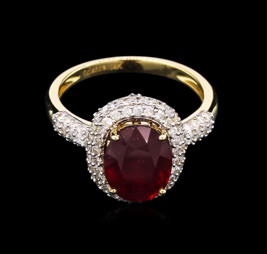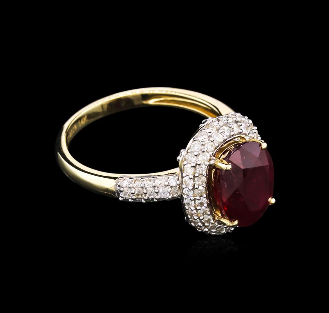 Fourteen karat (14K) yellow gold ruby and diamond ring. An oval cut ruby corundum gemstone is prong mounted in the center of the ring. Round brilliant cut diamonds accent the ring around the center gemstone and on both sides. The ring is cast stamped "14K" and has a gross weight of 4.3 Grams. Diamond(s): Shape: Round Brilliant cut. Weight: 0.78 carat. Average Clarity: I1-I2. Average Color: H-J. Symmetry: Very Good. Polish: Very Good. Gemstone(s): Gemstone: Ruby Corundum. Nature: Natural. Shape: Oval, Faceted. Quantity: 1, Mounted. Weight: 4.01 carat. Dimensions: Length- 9.79 mm. ; Width- 7.92 mm. Bulge: Visible. Clarity: I1, Type 2. Color: Red (5/5). Symmetry: Very Good. Color Intensity: Medium. Transparency: Transparent. Tone: Dark. Enhancements: Indications of high temperature heat treatment, with glass and flux additives. Metal(s): Metal: Gold, Stamped. Purity: 14K. Color: Yellow. Condition: Excellent. Finish: High polish. GGA Appraised at $4,360.00.