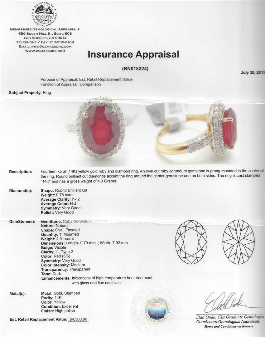 Fourteen karat (14K) yellow gold ruby and diamond ring. An oval cut ruby corundum gemstone is prong mounted in the center of the ring. Round brilliant cut diamonds accent the ring around the center gemstone and on both sides. The ring is cast stamped "14K" and has a gross weight of 4.3 Grams. Diamond(s): Shape: Round Brilliant cut. Weight: 0.78 carat. Average Clarity: I1-I2. Average Color: H-J. Symmetry: Very Good. Polish: Very Good. Gemstone(s): Gemstone: Ruby Corundum. Nature: Natural. Shape: Oval, Faceted. Quantity: 1, Mounted. Weight: 4.01 carat. Dimensions: Length- 9.79 mm. ; Width- 7.92 mm. Bulge: Visible. Clarity: I1, Type 2. Color: Red (5/5). Symmetry: Very Good. Color Intensity: Medium. Transparency: Transparent. Tone: Dark. Enhancements: Indications of high temperature heat treatment, with glass and flux additives. Metal(s): Metal: Gold, Stamped. Purity: 14K. Color: Yellow. Condition: Excellent. Finish: High polish. GGA Appraised at $4,360.00.