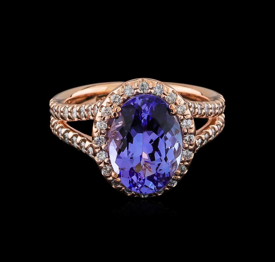 One electronically tested 14KT rose gold lady's cast fashion ring with a split shank halo with a bright polish finish. The featured lady's ring has a shank measuring 3.88 millimeters wide. Identified with markings of "14K". Condition is new, good workmanship. Containing: One prong set oval modified brilliant cut natural tanzanite, measuring 11.70 x 8.50 x 5.88mm, approximate weight of 4.01ct., clarity is eye clean, type I, medium, moderately strong, bluish violet color, (GIA bV 5/4), cut is very good. Transmitting light with no distortion, transparent. Colored gemstones are presumed to have been subjected to commonly used enhancement processes. Graded in the setting. Sixty prong set round brilliant cut diamonds, measuring 1.40 - 1.30 x 0.84mm (depth est.) approximate total weight of 60 Stones = 0.57ct. Graded in the setting. Clarity: SI-1 to I-1. Color: H - I. Cut Good. Total Weight of Colored Stones 4.01ct. Total Weight of Diamonds 0.57ct. Total Weight of Ring 7.30gm. GAS Appraised at $9,005.00.