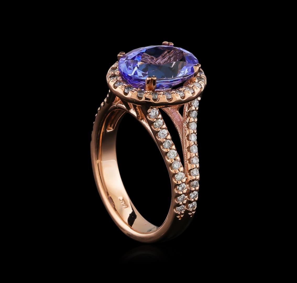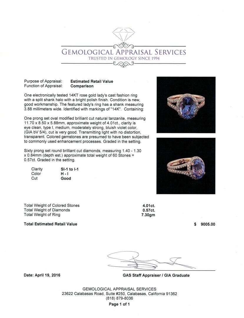 One electronically tested 14KT rose gold lady's cast fashion ring with a split shank halo with a bright polish finish. The featured lady's ring has a shank measuring 3.88 millimeters wide. Identified with markings of "14K". Condition is new, good workmanship. Containing: One prong set oval modified brilliant cut natural tanzanite, measuring 11.70 x 8.50 x 5.88mm, approximate weight of 4.01ct., clarity is eye clean, type I, medium, moderately strong, bluish violet color, (GIA bV 5/4), cut is very good. Transmitting light with no distortion, transparent. Colored gemstones are presumed to have been subjected to commonly used enhancement processes. Graded in the setting. Sixty prong set round brilliant cut diamonds, measuring 1.40 - 1.30 x 0.84mm (depth est.) approximate total weight of 60 Stones = 0.57ct. Graded in the setting. Clarity: SI-1 to I-1. Color: H - I. Cut Good. Total Weight of Colored Stones 4.01ct. Total Weight of Diamonds 0.57ct. Total Weight of Ring 7.30gm. GAS Appraised at $9,005.00.