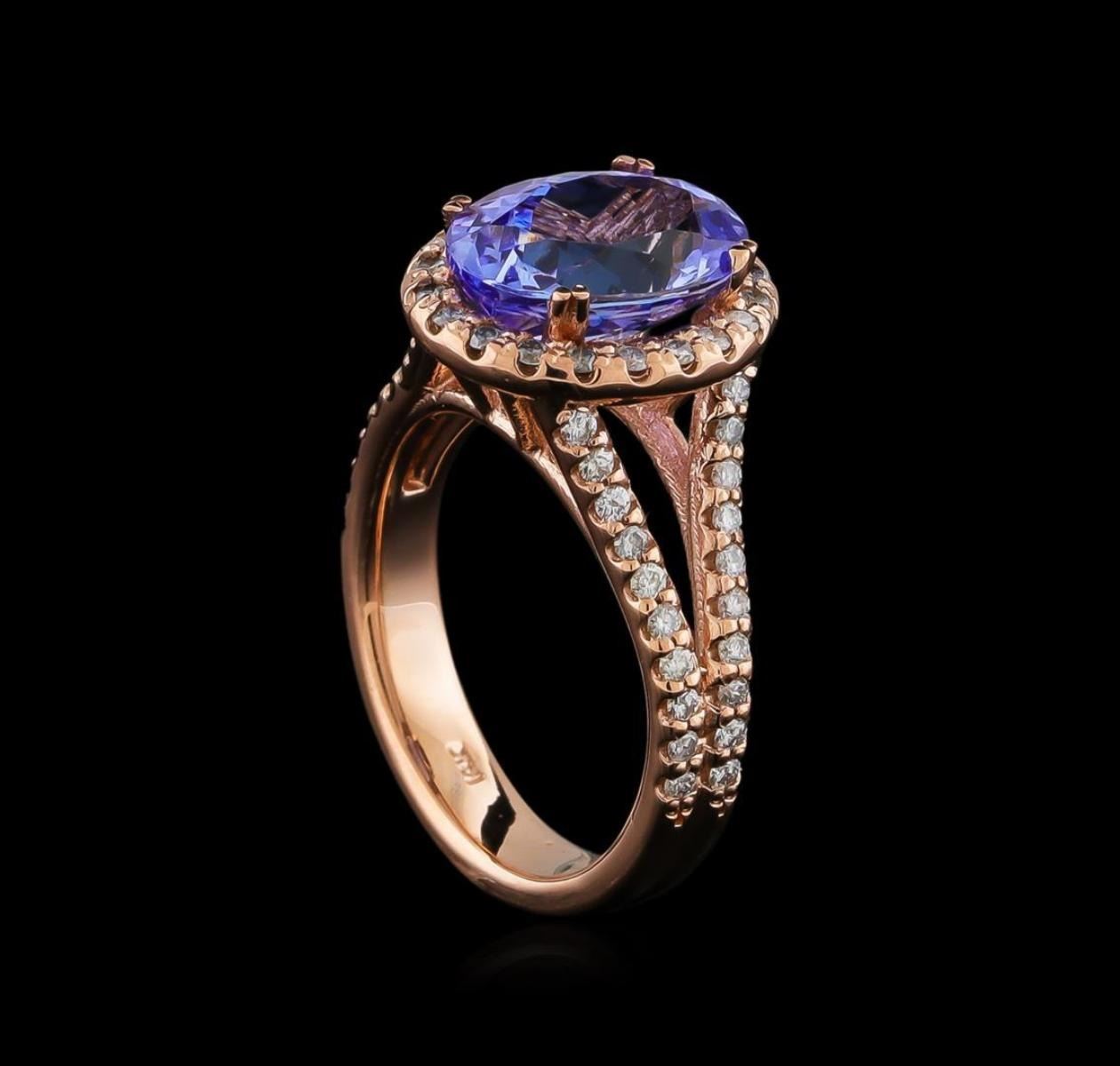 One electronically tested 14KT rose gold lady's cast fashion ring with a split shank halo with a bright polish finish. The featured lady's ring has a shank measuring 3.88 millimeters wide. Identified with markings of "14K". Condition is new, good workmanship. Containing: One prong set oval modified brilliant cut natural tanzanite, measuring 11.70 x 8.50 x 5.88mm, approximate weight of 4.01ct., clarity is eye clean, type I, medium, moderately strong, bluish violet color, (GIA bV 5/4), cut is very good. Transmitting light with no distortion, transparent. Colored gemstones are presumed to have been subjected to commonly used enhancement processes. Graded in the setting. Sixty prong set round brilliant cut diamonds, measuring 1.40 - 1.30 x 0.84mm (depth est.) approximate total weight of 60 Stones = 0.57ct. Graded in the setting. Clarity: SI-1 to I-1. Color: H - I. Cut Good. Total Weight of Colored Stones 4.01ct. Total Weight of Diamonds 0.57ct. Total Weight of Ring 7.30gm. GAS Appraised.