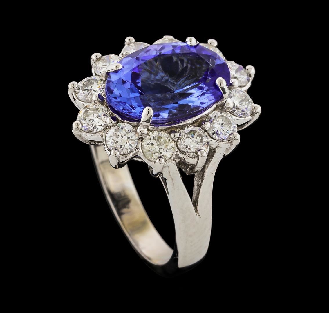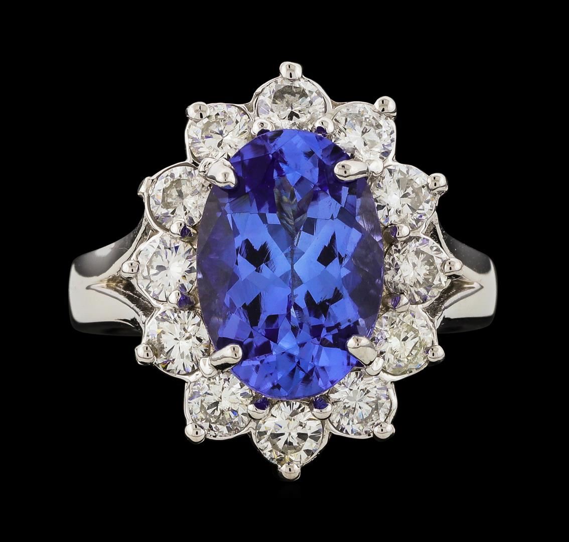 One electronically tested 14KT white gold lady's cast fashion ring with a split shank basket halo with a bright polish finish. The featured lady's ring has a shank measuring 2.94 millimeters wide. Identified with markings of '14K'. Condition is new, good workmanship. Containing: One prong set oval modified brilliant cut natural tanzanite, measuring 12.38 x 8.58 x 5.50mm, (depth est.) approximate weight of 4.01ct., clarity is eye clean, medium light, moderately strong, violet color, (GIA V 4/4), cut is very good. Transmitting light with no distortion, transparent. Colored gemstones are presumed to have been subjected to commonly used enhancement processes. Graded in the setting. Twelve prong set round brilliant cut diamonds, measuring 3.10 - 3.00 x 1.89mm (depth est.) approximate total weight of 12 Stones = 1.30ct. Graded in the setting. Clarity SI-1 to SI-2. Color: H - I Cut Good. Total Weight of Colored Stones 4.01ct.. Total Weight of Diamonds 1.30ct.. Total Weight of Ring 7.60gm. GAS Appraised at $8,550.00.