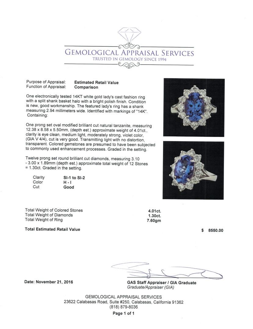 One electronically tested 14KT white gold lady's cast fashion ring with a split shank basket halo with a bright polish finish. The featured lady's ring has a shank measuring 2.94 millimeters wide. Identified with markings of '14K'. Condition is new, good workmanship. Containing: One prong set oval modified brilliant cut natural tanzanite, measuring 12.38 x 8.58 x 5.50mm, (depth est.) approximate weight of 4.01ct., clarity is eye clean, medium light, moderately strong, violet color, (GIA V 4/4), cut is very good. Transmitting light with no distortion, transparent. Colored gemstones are presumed to have been subjected to commonly used enhancement processes. Graded in the setting. Twelve prong set round brilliant cut diamonds, measuring 3.10 - 3.00 x 1.89mm (depth est.) approximate total weight of 12 Stones = 1.30ct. Graded in the setting. Clarity SI-1 to SI-2. Color: H - I Cut Good. Total Weight of Colored Stones 4.01ct.. Total Weight of Diamonds 1.30ct.. Total Weight of Ring 7.60gm. GAS Appraised at $8,550.00.