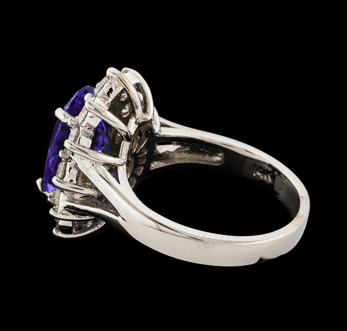 One electronically tested 14KT white gold lady's cast fashion ring with a split shank basket halo with a bright polish finish. The featured lady's ring has a shank measuring 2.94 millimeters wide. Identified with markings of '14K'. Condition is new, good workmanship. Containing: One prong set oval modified brilliant cut natural tanzanite, measuring 12.38 x 8.58 x 5.50mm, (depth est.) approximate weight of 4.01ct., clarity is eye clean, medium light, moderately strong, violet color, (GIA V 4/4), cut is very good. Transmitting light with no distortion, transparent. Colored gemstones are presumed to have been subjected to commonly used enhancement processes. Graded in the setting. Twelve prong set round brilliant cut diamonds, measuring 3.10 - 3.00 x 1.89mm (depth est.) approximate total weight of 12 Stones = 1.30ct. Graded in the setting. Clarity SI-1 to SI-2. Color: H - I Cut Good. Total Weight of Colored Stones 4.01ct.. Total Weight of Diamonds 1.30ct.. Total Weight of Ring 7.60gm. GAS Appraised.