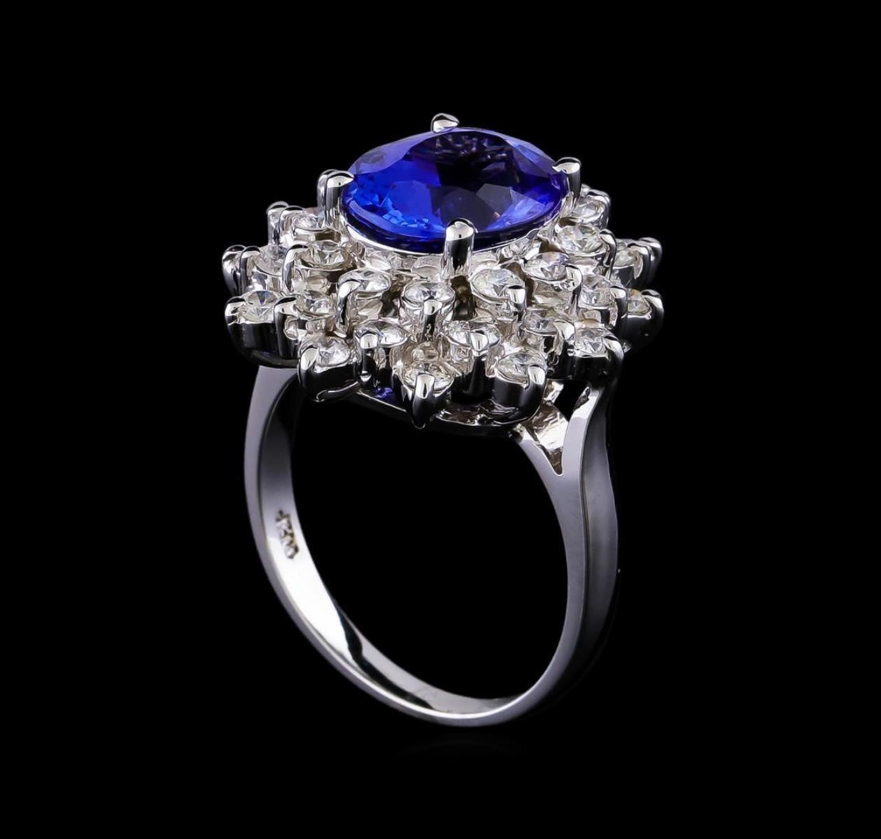 One electronically tested 14KT white gold lady's cast fashion ring with a double basket halo with a bright polish finish. The featured lady's ring has a shank measuring 2.31 millimeters in width. Identified with markings of "K14". Condition is new, good workmanship. Containing: One prong set oval oval modified brilliant cut natural tanzanite, measuring 10.94 x 9.02 x 5.95mm, (depth est.) approximate weight of 4.01ct., clarity is eye clean, medium, moderately strong, bluish violet color, (GIA bV 5/4), cut is very good. Transmitting light with no distortion, transparent. Colored gemstones are presumed to have been subjected to commonly used enhancement processes. Graded in the setting. Thirty-Six prong set round brilliant cut diamonds, measuring 2.30 - 2.20 x 1.37mm (depth est.) approximate total weight of 36 Stones = 1.48ct. Graded in the setting. Clarity: SI-1 to SI-2. Color: G - I. Cut Good. Total Weight of Colored Stones 4.01ct. Total Weight of Diamonds 1.48ct. Total Weight of Ring 7.20gm. GAS Appraised.