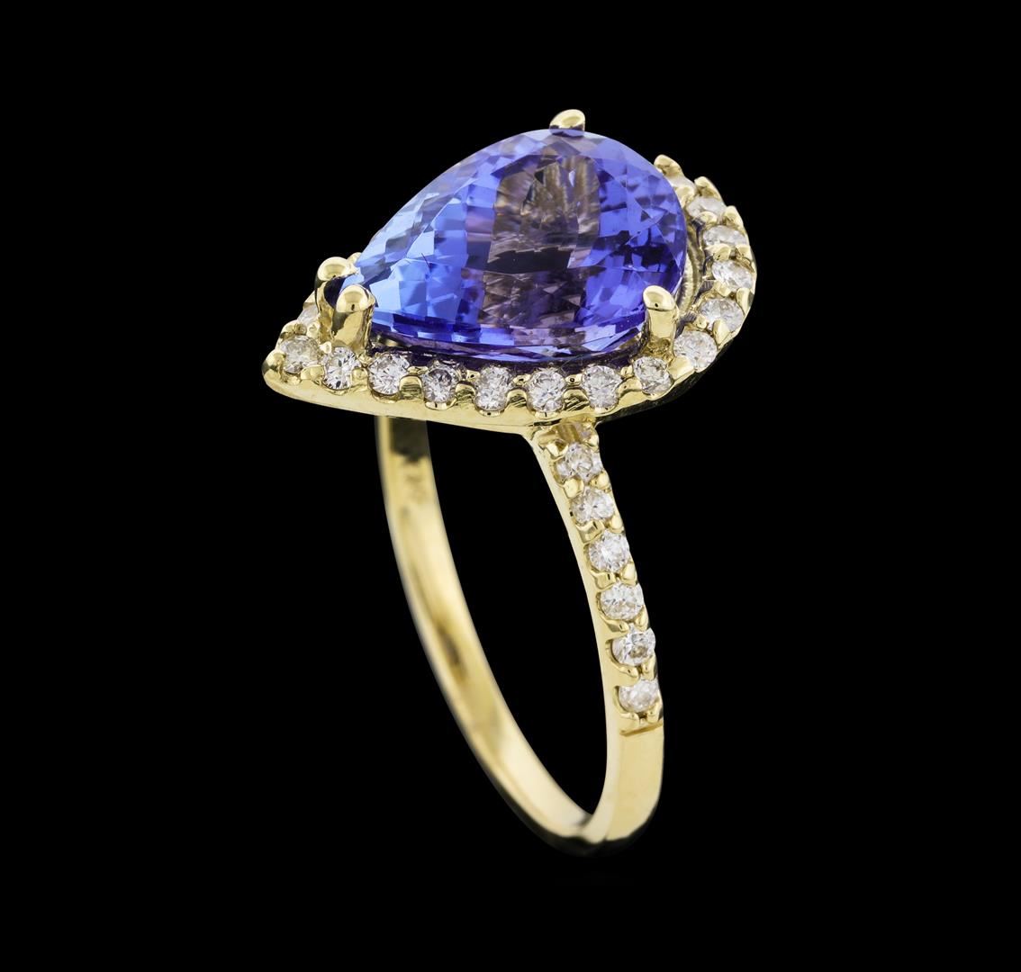 One electronically tested 14KT yellow gold lady's cast fashion ring with a basket halo with a bright polish finish. The featured lady's ring has a shank measuring 1.53 millimeters wide. Identified with markings of 'K14'. Condition is new, good workmanship. Containing: One prong set pear modified brilliant cut natural tanzanite, measuring 11.80 x 9.08 x 6.06mm, (depth est.) approximate weight of 4.01ct., clarity is eye clean, medium, very slightly grayish, violet color, (GIA V 5/3), cut is good. Transmitting light with no distortion, transparent. Colored gemstones are presumed to have been subjected to commonly used enhancement processes. Graded in the setting. Thirty-Five prong set round brilliant cut diamonds, measuring 1.50 - 1.40 x 0.90mm (depth est.) approximate total weight of 35 Stones = 0.41ct. Graded in the setting. Clarity SI-1 to I-1. Color: H - I Cut Good. Total Weight of Colored Stones 4.01ct.. Total Weight of Diamonds 0.41ct.. Total Weight of Ring 3.50gm. GAS Appraised at $6,215.00.