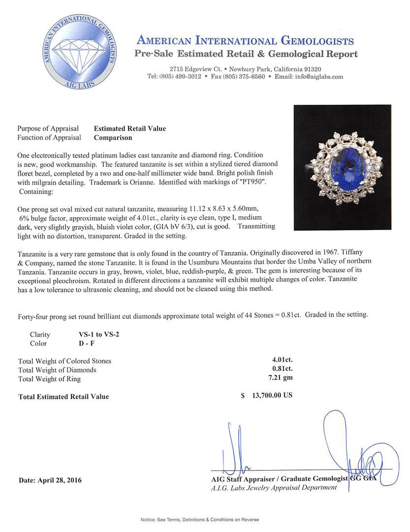 One electronically tested platinum ladies cast tanzanite and diamond ring. The featured tanzanite is set within a stylized tiered diamond floret bezel, completed by a two and one-half millimeter wide band. Bright polish finish with milgrain detailing. Trademark is Orianne. Identified with markings of "PT950". Condition is new, good workmanship. Containing: One prong set oval mixed cut natural tanzanite, measuring 11.12 x 8.63 x 5.60mm, 6%. bulge factor, approximate weight of 4.01ct., clarity is eye clean, type I, medium dark, very slightly grayish, bluish violet color, (GIA bV 6/3), cut is good. Transmitting light with no distortion, transparent. Graded in the setting. Tanzanite is a very rare gemstone that is only found in the country of Tanzania. Originally discovered in 1967. Tiffany & Company, named the stone Tanzanite. It is found in the Usumburu Mountains that border the Umba Valley of northern Tanzania. Tanzanite occurs in gray, brown, violet, blue, reddish-purple, & green. The gem is interesting because of its exceptional pleochroism. Rotated in different directions a tanzanite will exhibit multiple changes of color. Tanzanite has a low tolerance to ultrasonic cleaning, and should not be cleaned using this method. Forty-Four prong set round brilliant cut diamonds approximate total weight of 44 Stones = 0.81ct. Graded in the setting. Clarity: VS-1 to VS-2. Color: D - F. Total Weight of Colored Stones 4.01ct. Total Weight of Diamonds 0.81ct. Total Weight of Ring 7.21gm. AIG Appraised at $13,700.00.