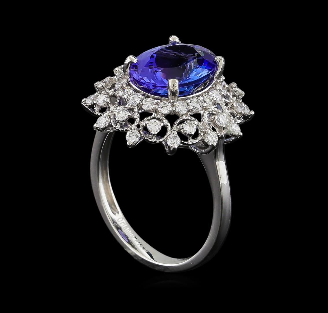 One electronically tested platinum ladies cast tanzanite and diamond ring. The featured tanzanite is set within a stylized tiered diamond floret bezel, completed by a two and one-half millimeter wide band. Bright polish finish with milgrain detailing. Trademark is Orianne. Identified with markings of "PT950". Condition is new, good workmanship. Containing: One prong set oval mixed cut natural tanzanite, measuring 11.12 x 8.63 x 5.60mm, 6%. bulge factor, approximate weight of 4.01ct., clarity is eye clean, type I, medium dark, very slightly grayish, bluish violet color, (GIA bV 6/3), cut is good. Transmitting light with no distortion, transparent. Graded in the setting. Tanzanite is a very rare gemstone that is only found in the country of Tanzania. Originally discovered in 1967. Tiffany & Company, named the stone Tanzanite. It is found in the Usumburu Mountains that border the Umba Valley of northern Tanzania. Tanzanite occurs in gray, brown, violet, blue, reddish-purple, & green. The gem is interesting because of its exceptional pleochroism. Rotated in different directions a tanzanite will exhibit multiple changes of color. Tanzanite has a low tolerance to ultrasonic cleaning, and should not be cleaned using this method. Forty-Four prong set round brilliant cut diamonds approximate total weight of 44 Stones = 0.81ct. Graded in the setting. Clarity: VS-1 to VS-2. Color: D - F. Total Weight of Colored Stones 4.01ct. Total Weight of Diamonds 0.81ct. Total Weight of Ring 7.21gm. AIG Appraised at $13,700.00.