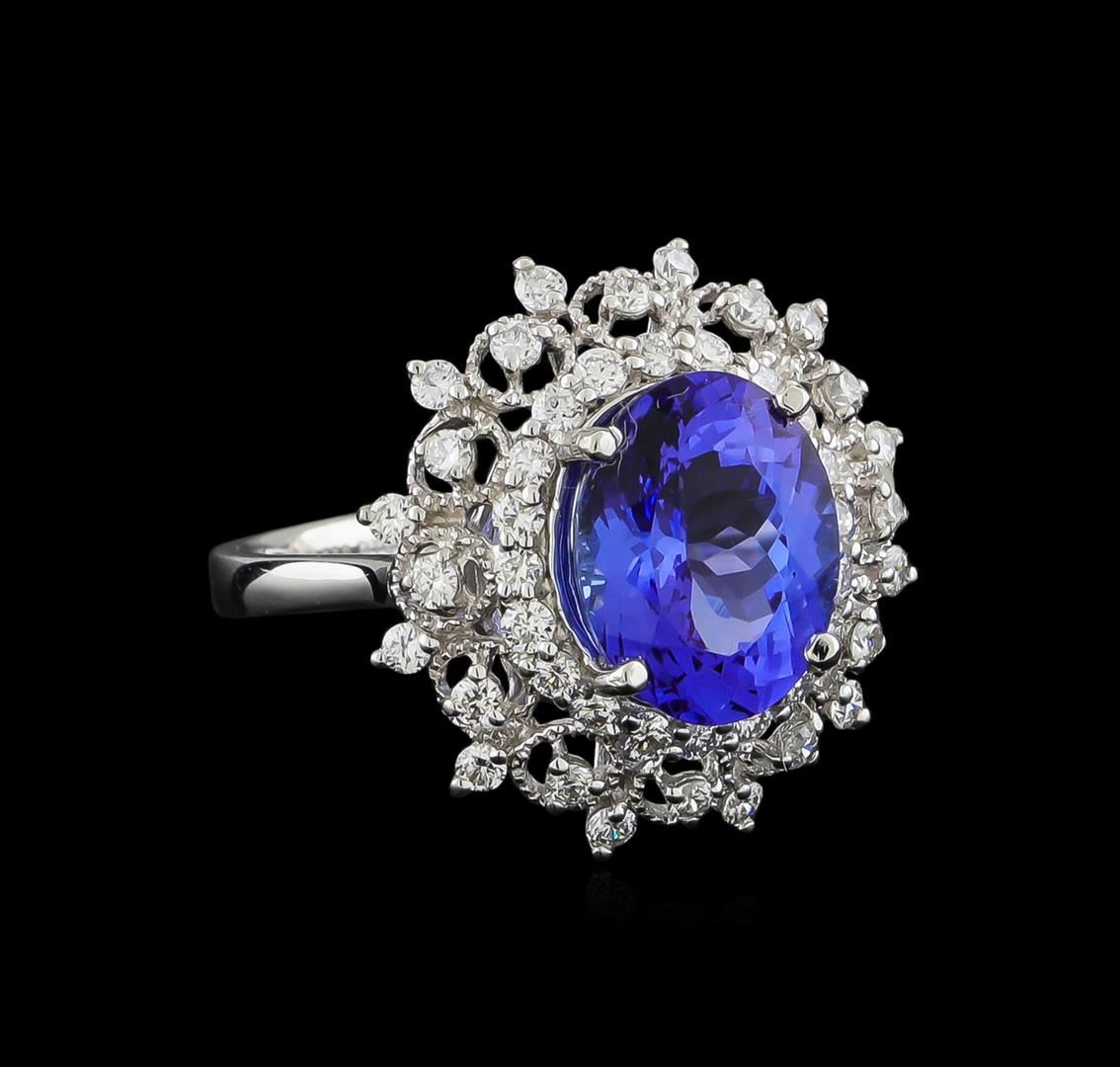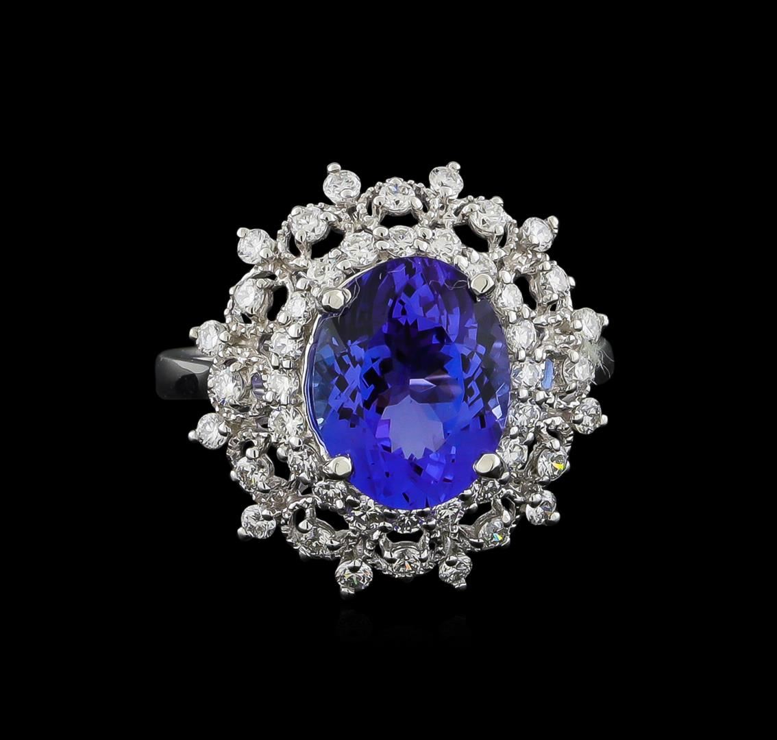 One electronically tested platinum ladies cast tanzanite and diamond ring. The featured tanzanite is set within a stylized tiered diamond floret bezel, completed by a two and one-half millimeter wide band. Bright polish finish with milgrain detailing. Trademark is Orianne. Identified with markings of "PT950". Condition is new, good workmanship. Containing: One prong set oval mixed cut natural tanzanite, measuring 11.12 x 8.63 x 5.60mm, 6%. bulge factor, approximate weight of 4.01ct., clarity is eye clean, type I, medium dark, very slightly grayish, bluish violet color, (GIA bV 6/3), cut is good. Transmitting light with no distortion, transparent. Graded in the setting. Tanzanite is a very rare gemstone that is only found in the country of Tanzania. Originally discovered in 1967. Tiffany & Company, named the stone Tanzanite. It is found in the Usumburu Mountains that border the Umba Valley of northern Tanzania. Tanzanite occurs in gray, brown, violet, blue, reddish-purple, & green. The gem is interesting because of its exceptional pleochroism. Rotated in different directions a tanzanite will exhibit multiple changes of color. Tanzanite has a low tolerance to ultrasonic cleaning, and should not be cleaned using this method. Forty-Four prong set round brilliant cut diamonds approximate total weight of 44 Stones = 0.81ct. Graded in the setting. Clarity: VS-1 to VS-2. Color: D - F. Total Weight of Colored Stones 4.01ct. Total Weight of Diamonds 0.81ct. Total Weight of Ring 7.21gm. AIG Appraised at $13,700.00.