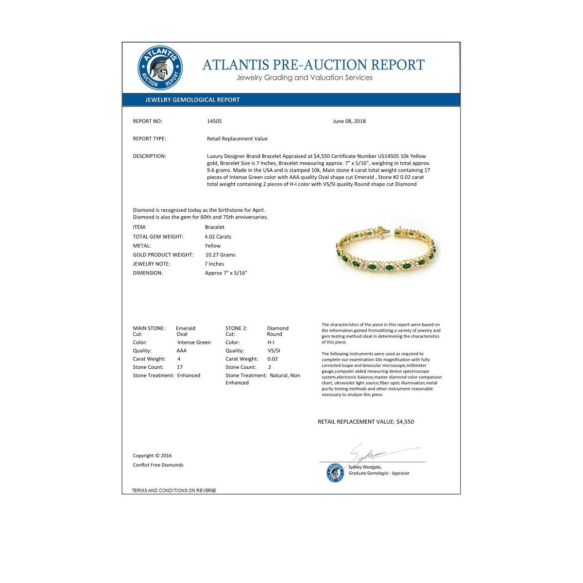 REF-69M3H -14505 ---- 4.02 CTW Emerald & Diamond Bracelet 10K Yellow Gold ---- Luxury Designer Brand Bracelet Appraised at $4,550 Certificate Number US14505  10k Yellow gold,  Bracelet Size is 7 Inches, Bracelet measuring approx. 7" x  5/16", weighing in total approx. 9.6 grams. Made in the USA and is stamped 10k, Main stone 4 carat total weight containing 17 pieces of Intense Green color with AAA quality Oval shape cut Emerald , Stone #2 0.02 carat total weight containing 2 pieces of H-I color with  VS/SI quality Round shape cut Diamond