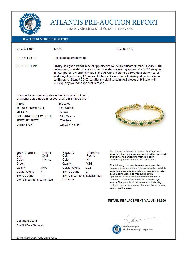 4.02 CTW Emerald & Diamond Bracelet 10K Yellow Gold ---- Luxury Designer Brand Bracelet Appraised Retail Price at $4,550 ---- SKU Number US14505 10k Yellow gold Bracelet Size is 7 Inches, Bracelet measuring approx. 7" x 5/16", weighing in total approx. 9.6 grams. Made in the USA and is stamped 10k, Main stone 4 carat total weight containing 17 pieces of Intense Green color with AAA quality Oval shape cut Emerald , Stone #2 0.02 carat total weight containing 2 pieces of H-I color with VS/SI quality Round shape cut