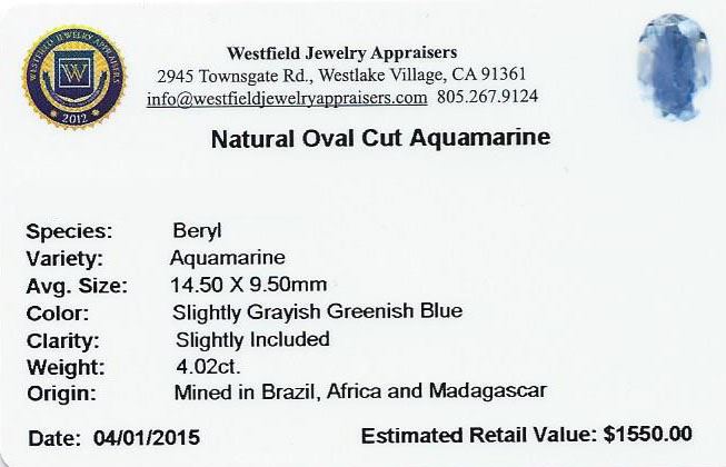 One oval cut natural aquamarine exact weight 4.02ct., clarity is slightly included, type I, medium light, very slightly grayish, very slightly greenish blue color, (GIA vslgB 4/3), cut is good. Westfield Appraised at $1,550.00.