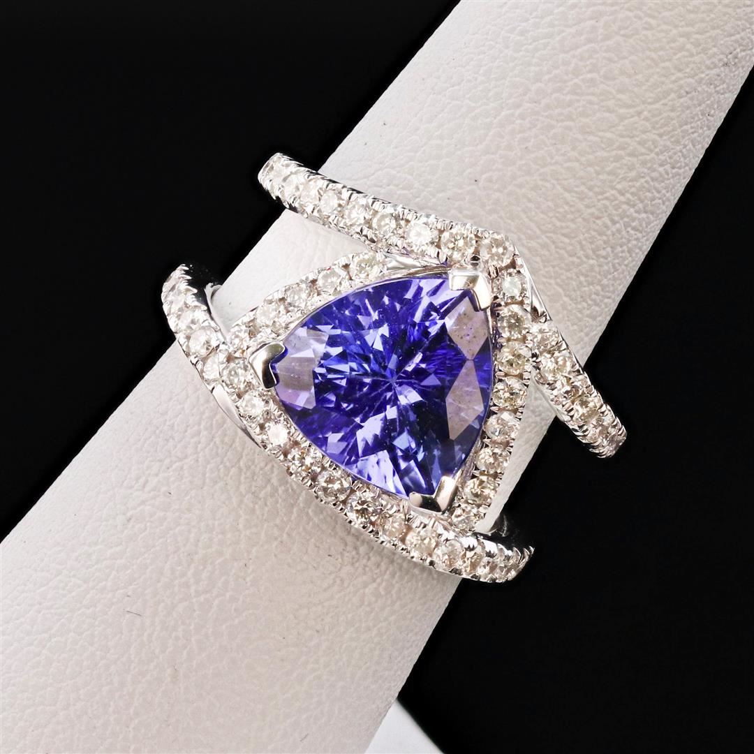 Eighteen karat (18K) white gold natural tanzanite zoisite and diamond ring. A triangular brilliant cut natural tanzanite zoisite gemstone is mounted in the center of the ring. Round brilliant cut diamonds accent the ring around and on both sides of the ce
