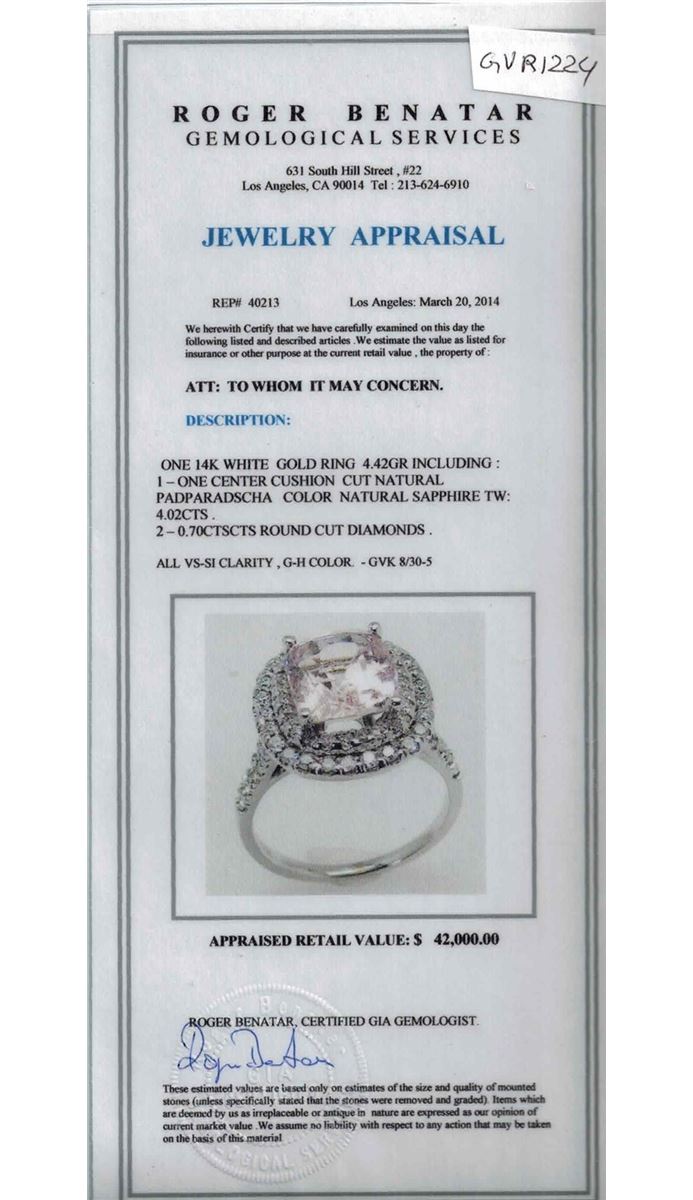 14K WHITE GOLD NATURAL CEYLONE PADPARADSCHA SAPPHIRE RING 4.42GRAM :4.42 GRAMS/PADPARADSCHA SAPPHIRE 4.02CT:4.02CT/DIAMOND 0.70CT:0.70CT/#GVR1224
