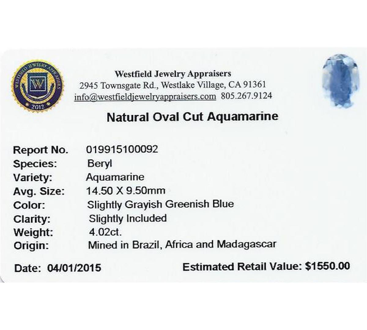 One oval cut natural aquamarine exact weight 4.02ct., clarity is slightly included, type I, medium light, very slightly grayish, very slightly greenish blue color, (GIA vslgB 4/3), cut is good. Westfield Appraised at $1,550.00.