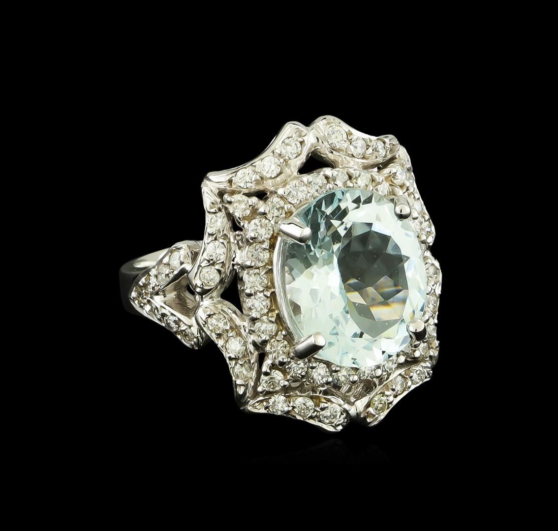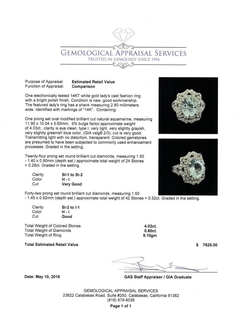 One electronically tested 14KT white gold lady's cast fashion ring with a bright polish finish. The featured lady's ring has a shank measuring 2.80 millimeters wide. Identified with markings of "14K". Condition is new, good workmanship. Containing: One prong set oval modified brilliant cut natural aquamarine, measuring 11.90 x 10.04 x 5.60mm, 5%. bulge factor, approximate weight of 4.03ct., clarity is eye clean, type I, very light, very slightly grayish, very slightly greenish blue color, (GIA vslgB 2/3), cut is very good. Transmitting light with no distortion, transparent. Colored gemstones are presumed to have been subjected to commonly used enhancement processes. Graded in the setting. Twenty-Four prong set round brilliant cut diamonds, measuring 1.50 - 1.40 x 0.90mm (depth est.) approximate total weight of 24 Stones = 0.28ct. Graded in the setting. Clarity: SI-1 to SI-2. Color: H - I. Cut Very Good Forty-Two prong set round brilliant cut diamonds, measuring 1.50 - 1.45 x 0.92mm (depth est.) approximate total weight of 42 Stones = 0.52ct. Graded in the setting. Clarity: SI-2 to I-1. Color: H - I. Cut Good. Total Weight of Colored Stones 4.03ct. Total Weight of Diamonds 0.80ct. Total Weight of Ring 9.10gm. GAS Appraised at $7,625.00.