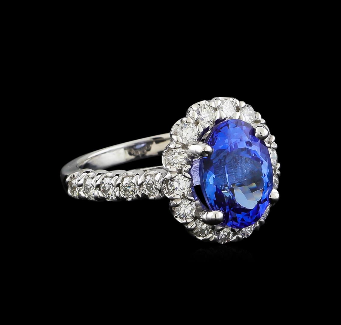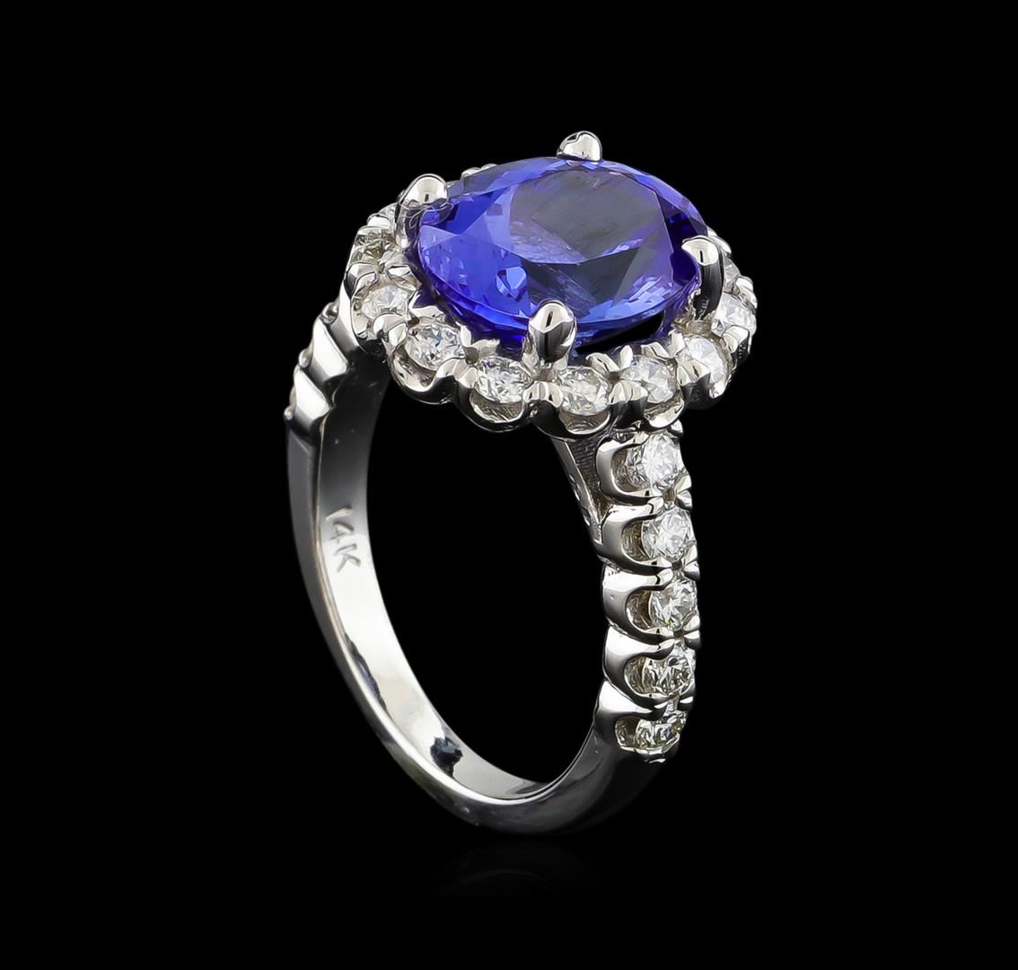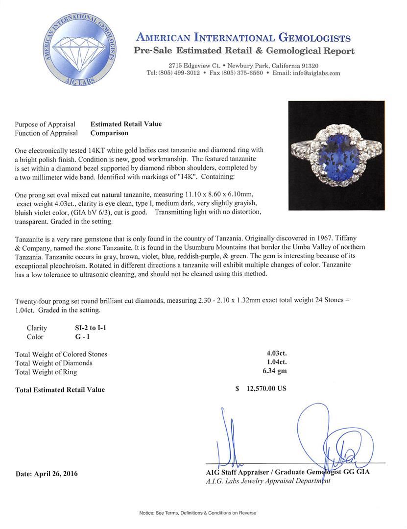 One electronically tested 14KT white gold ladies cast tanzanite and diamond ring with a bright polish finish. The featured tanzanite is set within a diamond bezel supported by diamond ribbon shoulders, completed by a two millimeter wide band. Identified with markings of "14K". Condition is new, good workmanship. Containing: One prong set oval mixed cut natural tanzanite, measuring 11.10 x 8.60 x 6.10mm, exact weight 4.03ct., clarity is eye clean, type I, medium dark, very slightly grayish, bluish violet color, (GIA bV 6/3), cut is good. Transmitting light with no distortion, transparent. Graded in the setting. Tanzanite is a very rare gemstone that is only found in the country of Tanzania. Originally discovered in 1967. Tiffany & Company, named the stone Tanzanite. It is found in the Usumburu Mountains that border the Umba Valley of northern Tanzania. Tanzanite occurs in gray, brown, violet, blue, reddish-purple, & green. The gem is interesting because of its exceptional pleochroism. Rotated in different directions a tanzanite will exhibit multiple changes of color. Tanzanite has a low tolerance to ultrasonic cleaning, and should not be cleaned using this method. Twenty-Four prong set round brilliant cut diamonds, measuring 2.30 - 2.10 x 1.32mm exact total weight 24 Stones = 1.04ct. Graded in the setting. Clarity: SI-2 to I-1. Color: G - I. Total Weight of Colored Stones 4.03ct. Total Weight of Diamonds 1.04ct. Total Weight of Ring 6.34gm. AIG Appraised at $12,570.00.