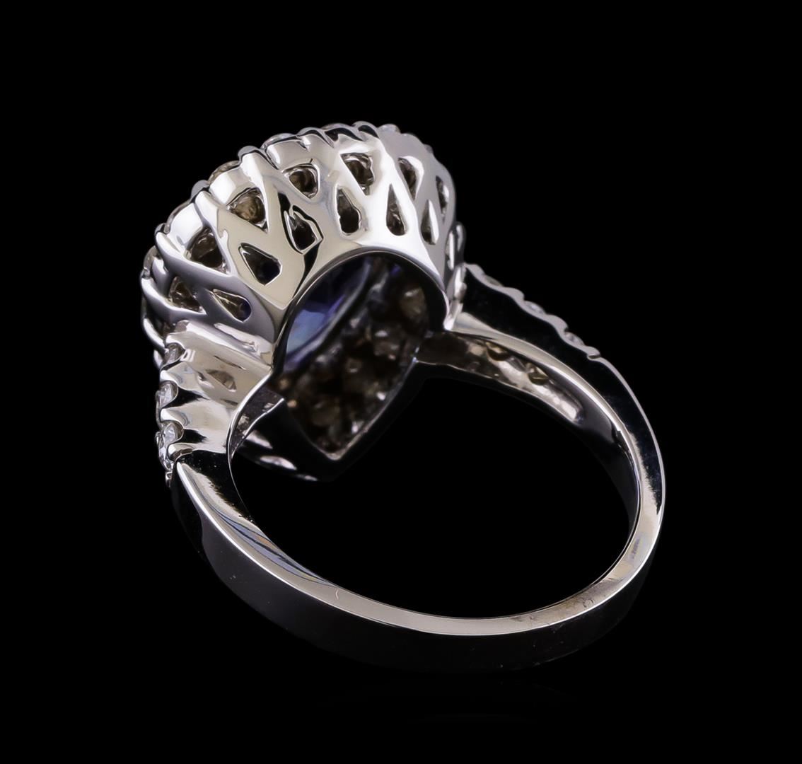 One electronically tested 14KT white gold lady's cast fashion ring with a basket halo with a bright polish finish. The featured lady's has a shank measuring 2.70 millimeters in width. Identified with markings of "14K". Condition is new, good workmanship. Containing: One prong set pear modified brilliant cut natural tanzanite, measuring 12.20 x 8.67 x 5.53mm, (depth est.) approximate weight of 4.03ct., clarity is eye clean, medium, very slightly grayish, bluish violet color, (GIA bV 5/3), cut is very good. Transmitting light with no distortion, transparent. Colored gemstones are presumed to have been subjected to commonly used enhancement processes. Graded in the setting. Twenty-Five prong set round brilliant cut diamonds, measuring 2.30 - 2.20 x 1.37mm (depth est.) approximate total weight of 25 Stones = 1.04ct. Graded in the setting. Clarity: VS-2 to SI-2. Color: H - I. Cut Good. Total Weight of Colored Stones 4.03ct. Total Weight of Diamonds 1.04ct. Total Weight of Ring 7.20gm. GAS Appraised.