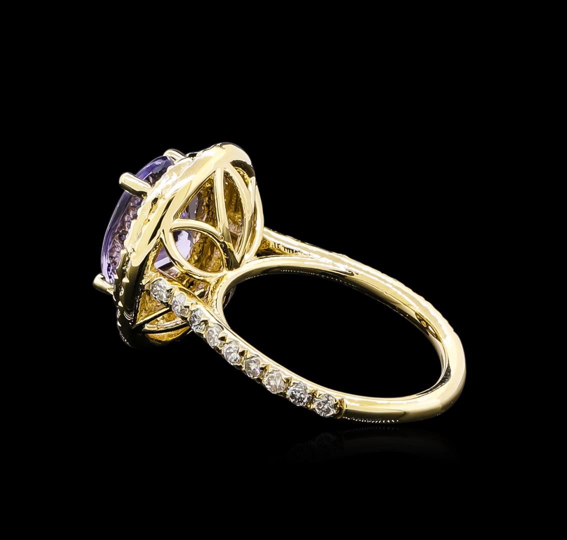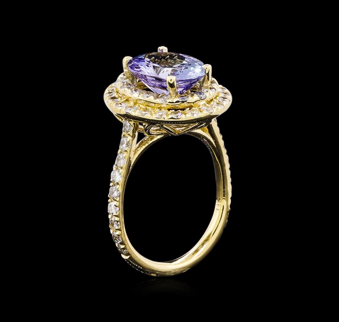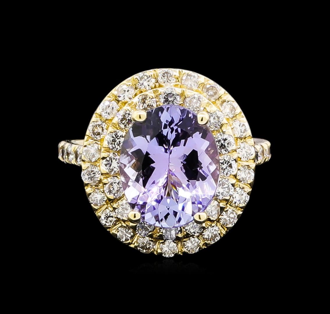 One electronically tested 14KT yellow gold ladies cast tanzanite and diamond ring with a bright polish finish. The featured tanzanite is set within tiered diamond bezels supported by a tuliped under gallery and diamond ribbon shoulders, completed by a one and one-half millimeter wide band. Identified with markings of "14K". Condition is new, good workmanship. Containing: One prong set oval mixed cut natural tanzanite, measuring 10.80 x 8.90 x 5.79mm, 3%. bulge factor, approximate weight of 4.03ct., clarity is eye clean, type I, medium, very slightly grayish, violet color, (GIA V 5/3), cut is good. Transmitting light with no distortion, transparent. Graded in the setting. Tanzanite is a very rare gemstone that is only found in the country of Tanzania. Originally discovered in 1967. Tiffany & Company, named the stone Tanzanite. It is found in the Usumburu Mountains that border the Umba Valley of northern Tanzania. Tanzanite occurs in gray, brown, violet, blue, reddish-purple, & green. The gem is interesting because of its exceptional pleochroism. Rotated in different directions a tanzanite will exhibit multiple changes of color. Tanzanite has a low tolerance to ultrasonic cleaning, and should not be cleaned using this method. Fifty-Six prong set round brilliant cut diamonds, measuring 1.90 - 1.80 x 1.11mm (depth est.) approximate total weight of 56 Stones = 1.39ct. Graded in the setting. Clarity: SI-2 to I-2. Color: G - I. Total Weight of Colored Stones 4.03ct. Total Weight of Diamonds 1.39ct. Total Weight of Ring 5.41gm. AIG Appraised at $10,995.00.