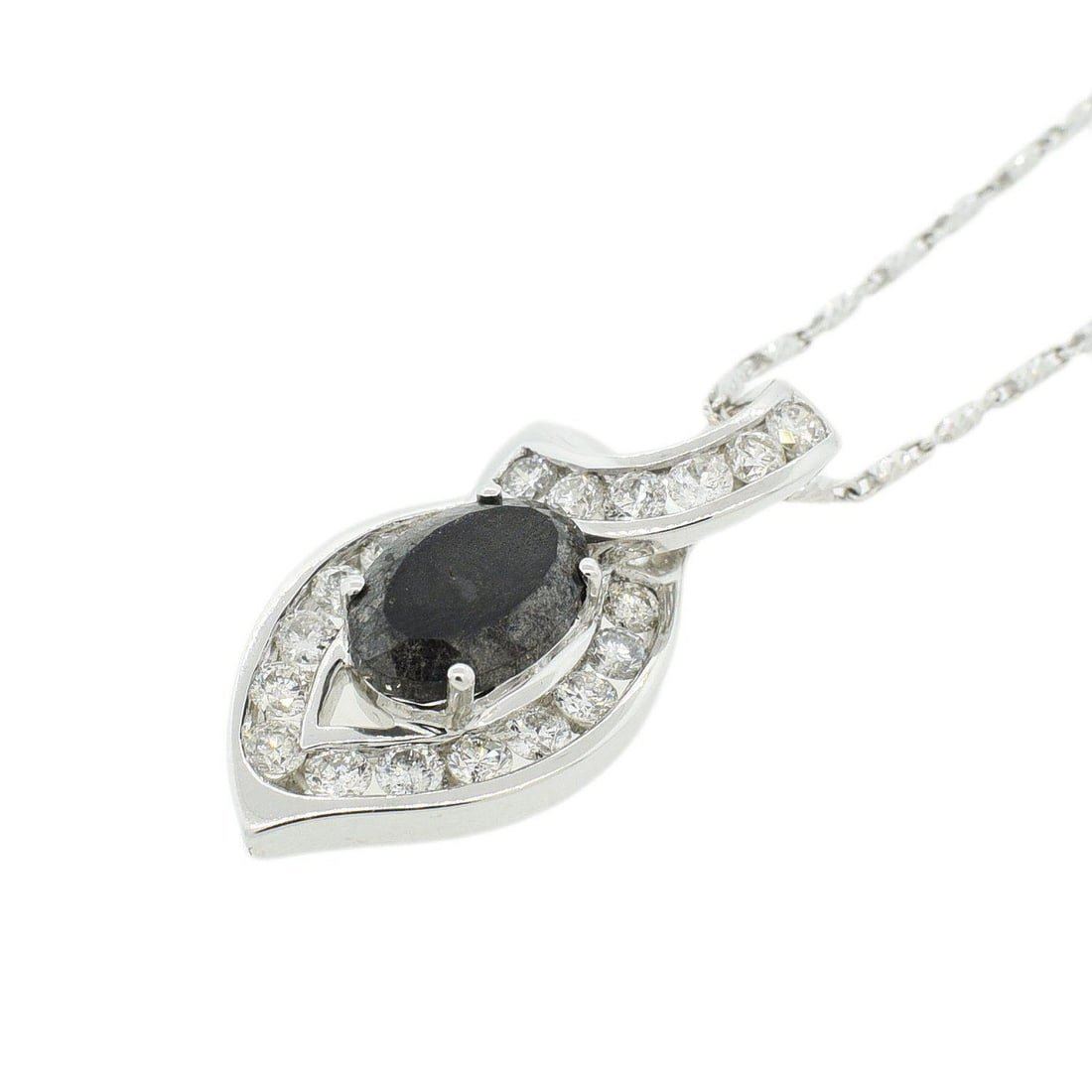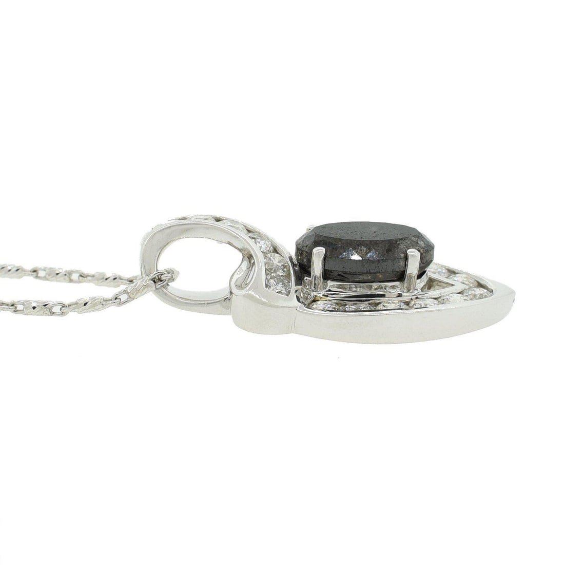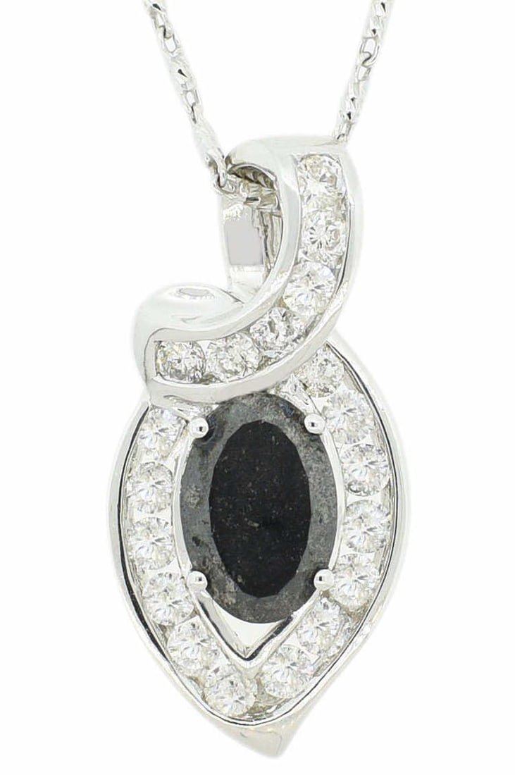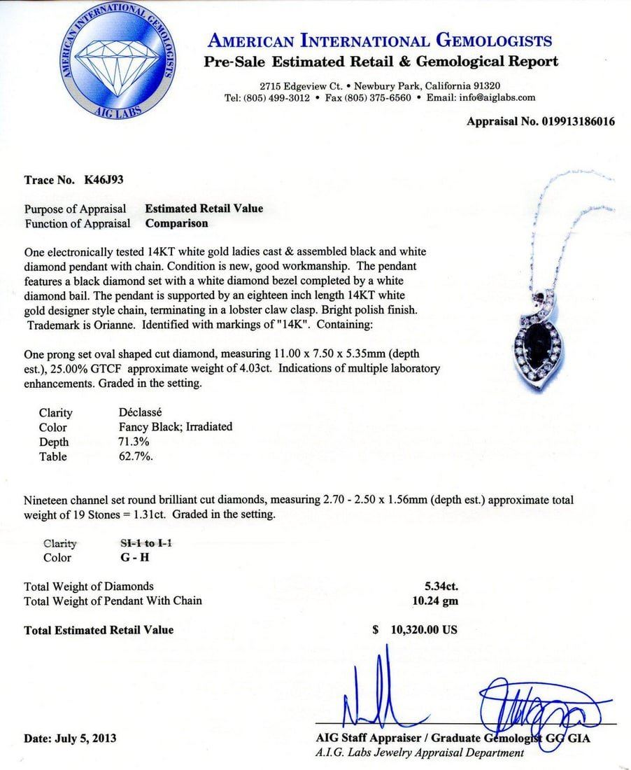 One electronically tested 14KT white gold ladies cast & assembled black and white diamond pendant with chain. Condition is new, good workmanship. The pendant features a black diamond set with a white diamond bezelcompleted by a white diamond bail. The pendant is supported by an eighteen inch length 14KT white gold designer style chain, terminating in a lobster claw clasp. Bright polish finish. Trademark is Orianne.Identified with markings of "14K". Containing: One prong set oval shaped cut diamond, measuring 11.00 x 7.50 x 5.35mm (depth est.), 25.00% GTCF approximate weight of 4.03ct. Indications of multiple laboratory enhancements. Graded in the setting. Clarity Déclassé Color Fancy Black Irradiated Depth 71.3% Table 62.7%. Nineteen channel set round brilliant cut diamonds, measuring 2.70 - 2.50 x 1.56mm (depth est.) approximate totalweight of 19 Stones = 1.31ctw. Graded in the setting. SI-1 to I-1 Color G - H Total Weight of Diamonds 5.34ct. Total Weight of Pendant With Chain 10.24 gm