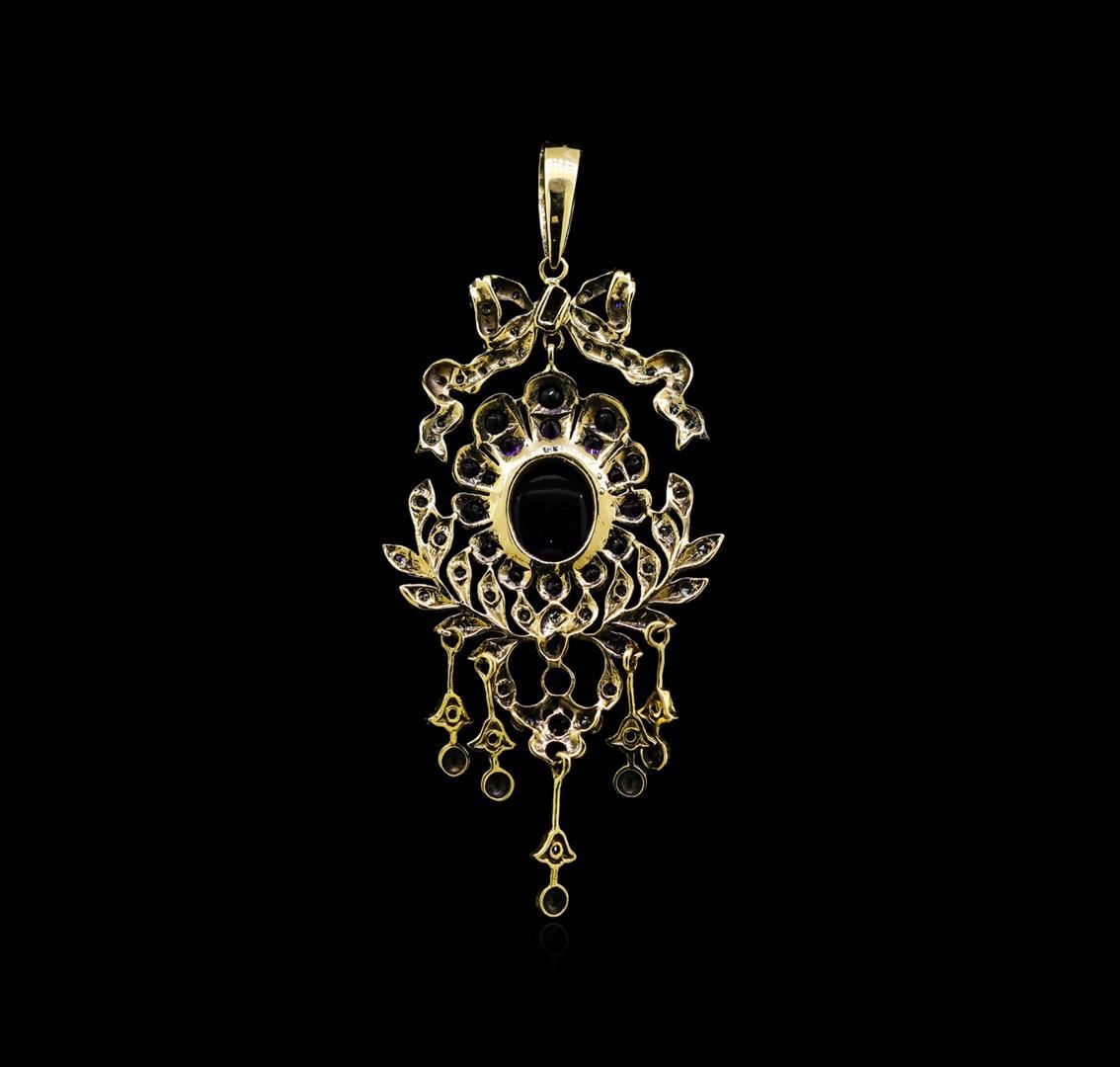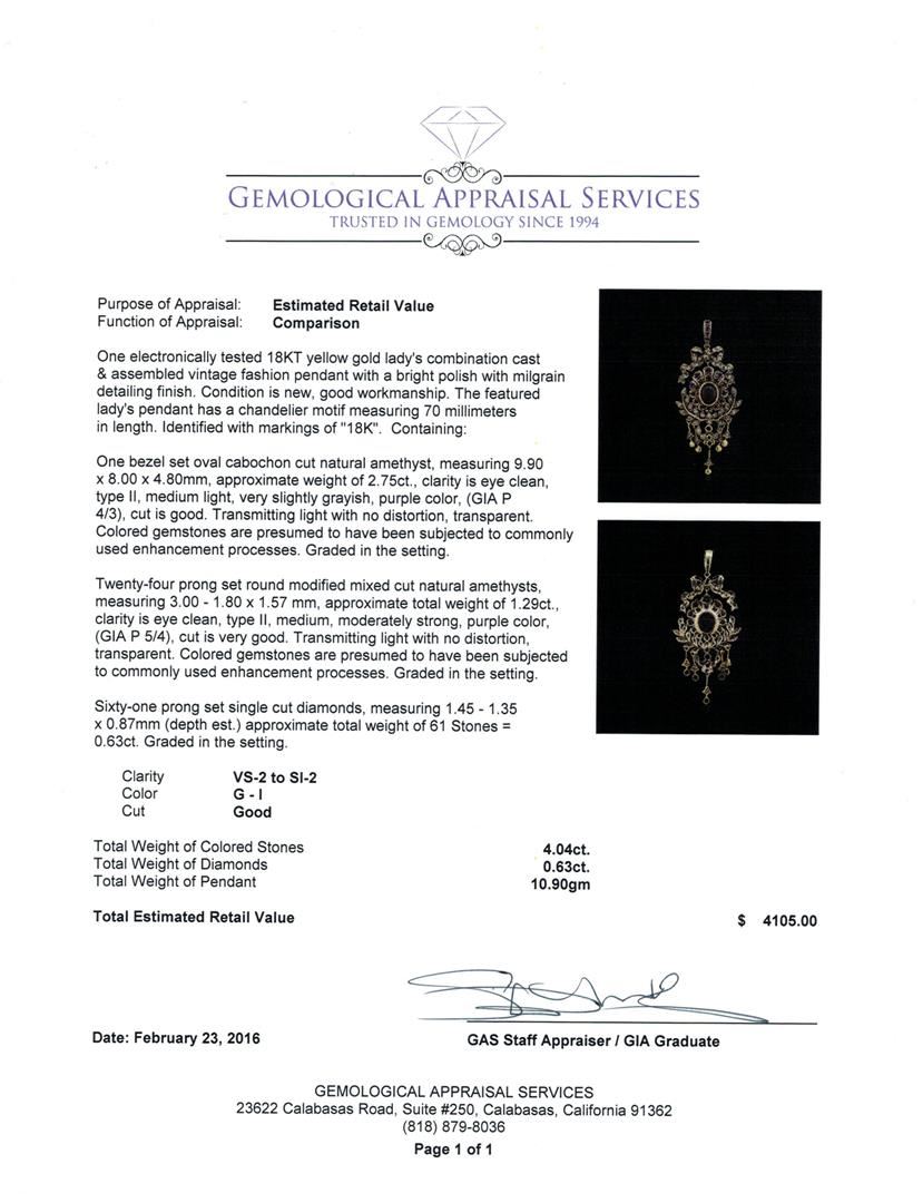 One electronically tested 18KT yellow gold lady's combination cast & assembled vintage fashion pendant with a bright polish with milgrain detailing finish. The featured lady's pendant has a chandelier motif measuring 70 millimeters in length. Identified with markings of "18K". Condition is new, good workmanship. Containing: One bezel set oval cabochon cut natural amethyst, measuring 9.90 x 8.00 x 4.80mm, approximate weight of 2.75ct., clarity is eye clean, type II, medium light, very slightly grayish, purple color, (GIA P 4/3), cut is good. Transmitting light with no distortion, transparent. Colored gemstones are presumed to have been subjected to commonly used enhancement processes. Graded in the setting.Twenty-four prong set round modified mixed cut natural amethysts, measuring 3.00 - 1.80 x 1.57 mm, approximate total weight of 1.29ct., clarity is eye clean, type II, medium, moderately strong, purple color, (GIA P 5/4), cut is very good. Transmitting light with no distortion, transparent. Colored gemstones are presumed to have been subjected to commonly used enhancement processes. Graded in the setting.Sixty-One prong set single cut diamonds, measuring 1.45 - 1.35 x 0.87mm (depth est.) approximate total weight of 61 Stones = 0.63ct. Graded in the setting. Clarity: VS-2 to SI-2. Color: G - ICut Good. Total Weight of Colored Stones 4.04ct. Total Weight of Diamonds 0.63ct. Total Weight of Pendant 10.90gm. GAS Appraised at $4,105.00.