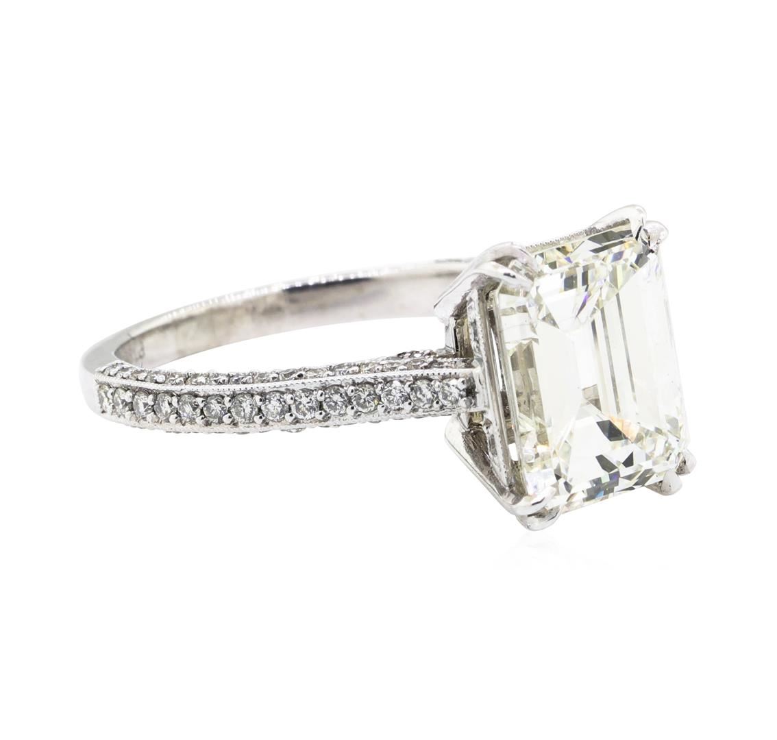 One electronically tested platinum lady's cast vintage style wedding ring with a cathedral shank with a bright polish with milgrain detailing finish. The featured lady's ring has a shank measuring 2.00 millimeters wide. Identified with markings of 'PT 950'. Condition is new, good workmanship. Containing: One prong set emerald cut diamond, measuring 10.15 x 8.19 x 5.37mm (depth est.) approximate weight of 4.00ct. Graded loose prior to setting in the EGL Laboratory, Report #US911600902D.Girdle: Thin to Slightly Thick PolishedCulet: NoneFluorescence: None. Color H Clarity VS-1 Cut Excellent One Hundred Twelve prong set round brilliant cut diamonds, measuring 1.10 - 1.00 x 0.65mm (depth est.) approximate total weight of 112 Stones = 0.50ct. Graded in the setting. Color F - G Clarity VS-1 to SI-1 Cut Very Good. Total Weight of Diamonds 4.50ct.. Total Weight of Ring 6.30gm GAS Appraised at $162155.00. GAS Appraised at $162,155.00.