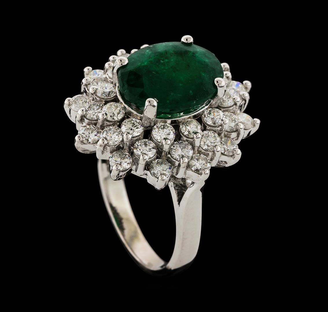 One electronically tested 14KT white gold lady's cast fashion ring with a staggered triple basket halo with a bright polish finish. The featured lady's ring has a shank measuring 2.56 millimeters wide. Identified with markings of 'K14'. Condition is new, good workmanship. Containing: One prong set oval modified mixed cut natural emerald, measuring 11.70 x 9.00 x 6.15mm, (depth est.) 10%. bulge factor, approximate weight of 4.04ct., clarity is heavily included, medium dark, moderately strong, green color, (GIA G 6/4), cut is good. Transmitting light somewhat diffusely, semi-transparent to translucent. Naturally occurring internal & external characteristics are present. Indications of oil residue. Colored gemstones are presumed to have been subjected to commonly used enhancement processes. Graded in the setting. Thirty-Six prong set round brilliant cut diamonds, measuring 2.50 - 2.40 x 1.52mm (depth est.) approximate total weight of 36 Stones = 1.98ct. Graded in the setting. Clarity SI-1 to I-1. Color: G - H Cut Good. Total Weight of Colored Stones 4.04ct.. Total Weight of Diamonds 1.98ct.. Total Weight of Ring 7.80gm. GAS Appraised at $9,410.00.