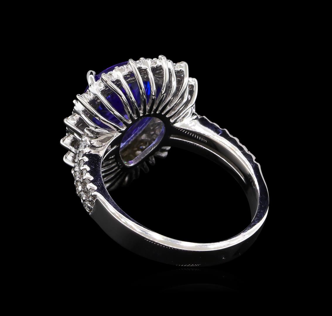 One electronically tested 14KT white gold lady's cast fashion ring with a basket double halo with a bright polish with milgrain detailing finish. The featured lady's ring has a shank measuring 3.04 millimeters wide. Identified with markings of "K14". Condition is new, good workmanship. Containing: One prong set pear modified brilliant cut natural tanzanite, measuring 13.93 x 8.81 x 5.10mm, approximate weight of 4.04ct., clarity is eye clean, type I, medium dark, moderately strong, violetish blue color, (GIA vB 6/4), cut is very good. Transmitting light with no distortion, transparent. Colored gemstones are presumed to have been subjected to commonly used enhancement processes. Graded in the setting. Sixteen prong set round brilliant cut diamonds, measuring 1.40 - 1.35 x 0.86mm (depth est.) approximate total weight of 16 Stones = 0.16ct. Graded in the setting. Clarity: SI-1 to SI-2. Color: H - I. Cut Good Forty-Four prong set round brilliant cut diamonds, measuring 1.25 - 1.15 x 0.76mm (depth est.) approximate total weight of 44 Stones = 0.30ct. Graded in the setting. Clarity: SI-1 to I-1. Color: H - I. Cut Good. Total Weight of Colored Stones 4.04ct. Total Weight of Diamonds 0.46ct. Total Weight of Ring 6.50gm. GAS Appraised at $9,365.00.