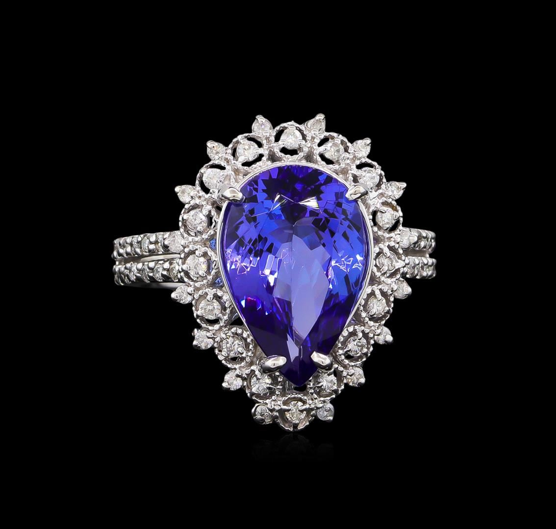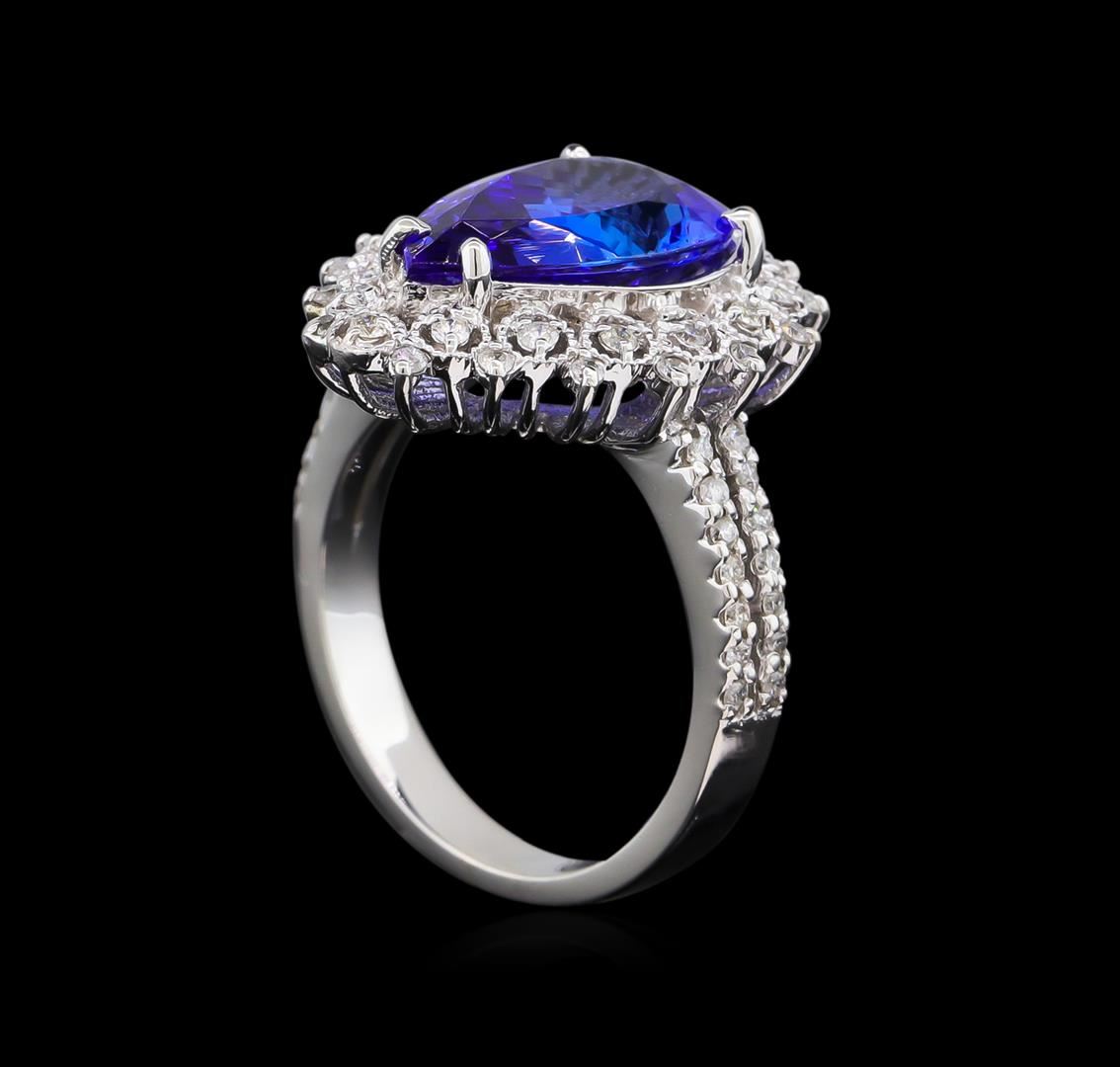 One electronically tested 14KT white gold lady's cast fashion ring with a basket double halo with a bright polish with milgrain detailing finish. The featured lady's ring has a shank measuring 3.04 millimeters wide. Identified with markings of "K14". Condition is new, good workmanship. Containing: One prong set pear modified brilliant cut natural tanzanite, measuring 13.93 x 8.81 x 5.10mm, approximate weight of 4.04ct., clarity is eye clean, type I, medium dark, moderately strong, violetish blue color, (GIA vB 6/4), cut is very good. Transmitting light with no distortion, transparent. Colored gemstones are presumed to have been subjected to commonly used enhancement processes. Graded in the setting. Sixteen prong set round brilliant cut diamonds, measuring 1.40 - 1.35 x 0.86mm (depth est.) approximate total weight of 16 Stones = 0.16ct. Graded in the setting. Clarity: SI-1 to SI-2. Color: H - I. Cut Good Forty-Four prong set round brilliant cut diamonds, measuring 1.25 - 1.15 x 0.76mm (depth est.) approximate total weight of 44 Stones = 0.30ct. Graded in the setting. Clarity: SI-1 to I-1. Color: H - I. Cut Good. Total Weight of Colored Stones 4.04ct. Total Weight of Diamonds 0.46ct. Total Weight of Ring 6.50gm. GAS Appraised at $9,365.00.