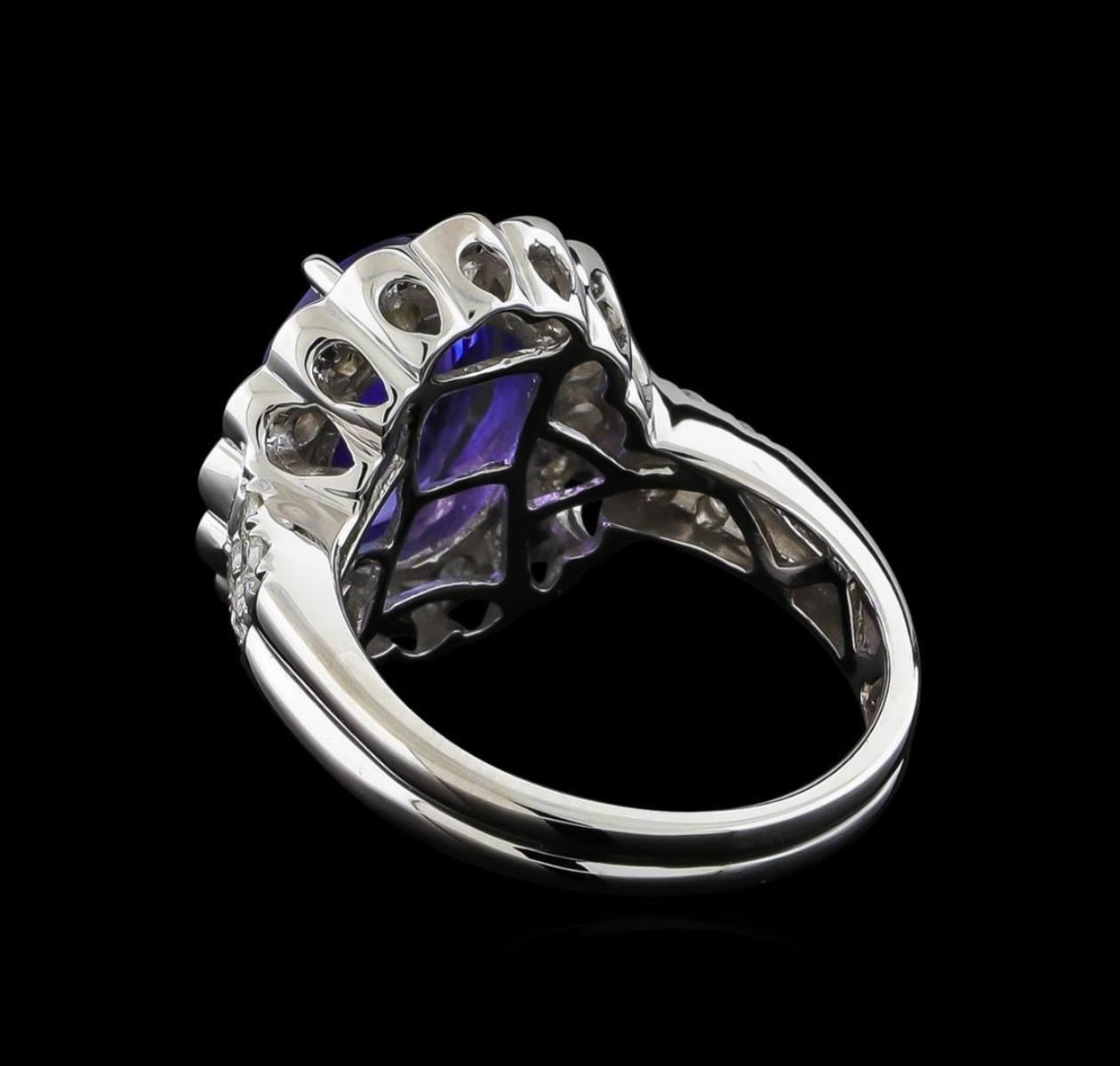 One electronically tested 14KT white gold ladies cast tanzanite and diamond ring with a bright polish finish. The featured tanzanite is set within a stylized diamond floret bezel supported by diamond set shoulders, completed by a grooved two and one-half millimeter wide band. Trademark is Orianne. Identified with markings of "14K". Condition is new, good workmanship. Containing: One prong set oval mixed cut natural tanzanite, measuring 11.60 x 8.80 x 5.31mm, 6%. bulge factor, approximate weight of 4.04ct., clarity is eye clean, type I, medium dark, very slightly grayish, bluish violet color, (GIA bV 6/3), cut is good. Transmitting light with no distortion, transparent. Graded in the setting. Tanzanite is a very rare gemstone that is only found in the country of Tanzania. Originally discovered in 1967. Tiffany & Company, named the stone Tanzanite. It is found in the Usumburu Mountains that border the Umba Valley of northern Tanzania. Tanzanite occurs in gray, brown, violet, blue, reddish-purple, & green. The gem is interesting because of its exceptional pleochroism. Rotated in different directions a tanzanite will exhibit multiple changes of color. Tanzanite has a low tolerance to ultrasonic cleaning, and should not be cleaned using this method. Sixteen half bezel set round brilliant cut diamonds, measuring 2.50 - 2.40 x 1.47mm (depth est.) approximate total weight of 16 Stones = 0.96ct. Graded in the setting. Clarity: I-1 to I-3. Color: H - J Eight prong set round brilliant cut diamonds, measuring 1.90 - 1.80 x 1.11mm (depth est.) approximate total weight of 8 Stones = 0.25ct. Graded in the setting. Clarity: I-2 to I-3. Color: G - H. Total Weight of Colored Stones 4.04ct. Total Weight of Diamonds 1.21ct. Total Weight of Ring 6.87gm. AIG Appraised.