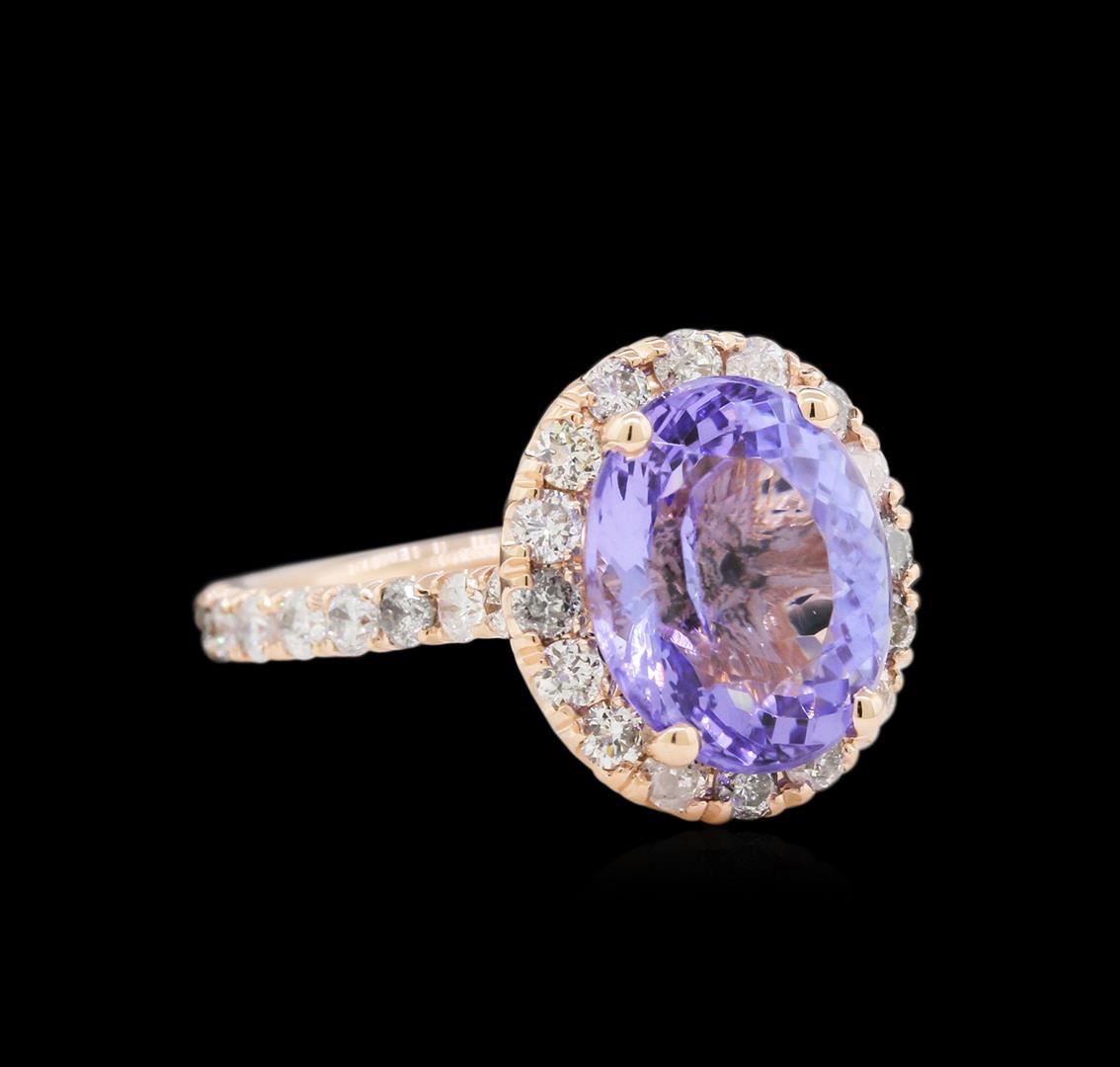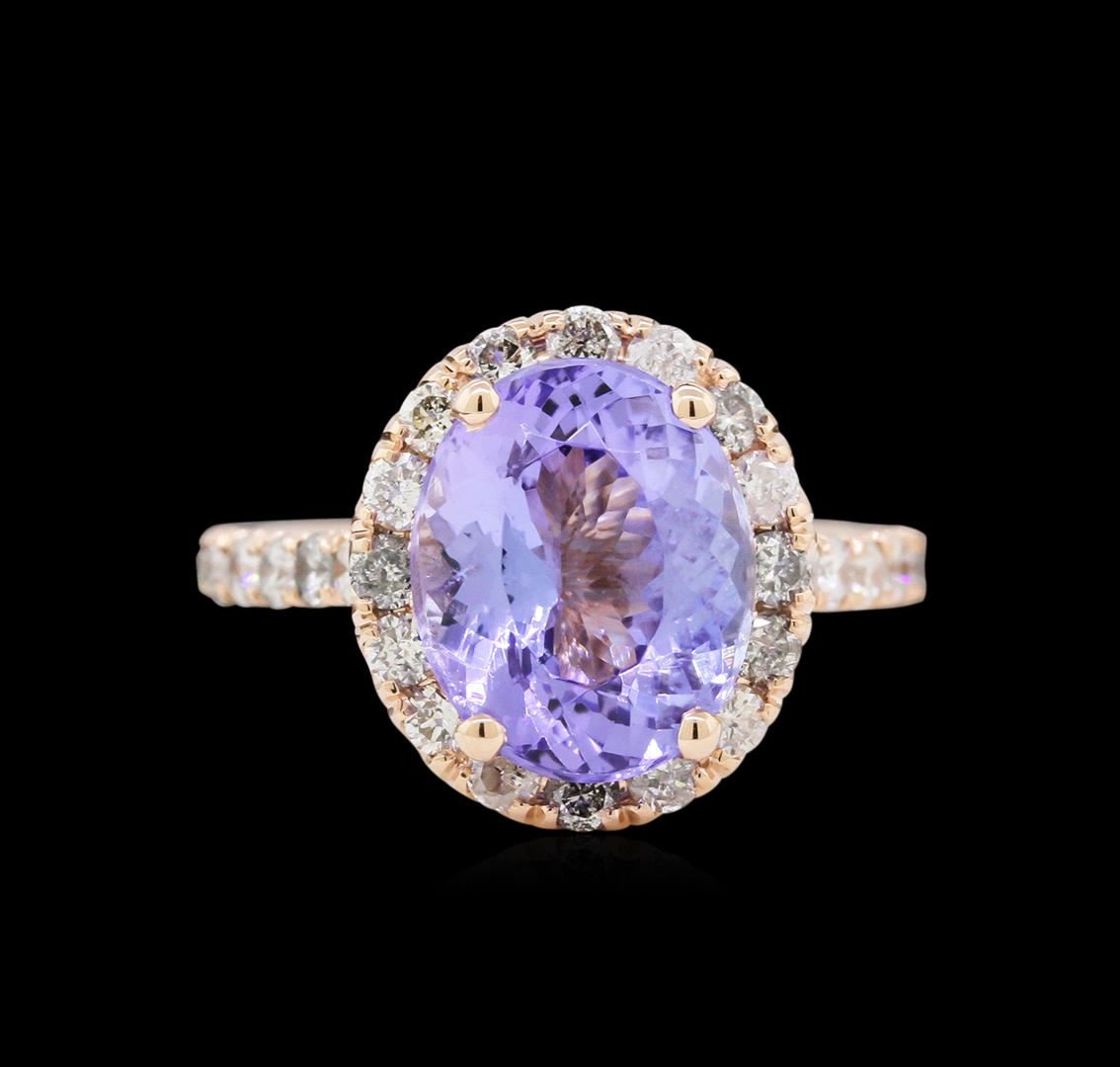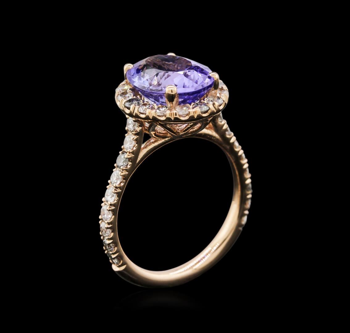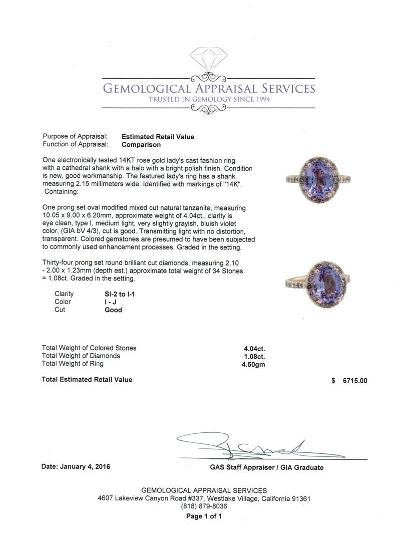 One electronically tested 14KT rose gold lady's cast fashion ring with a cathedral shank with a halo with a bright polish finish. The featured lady's ring has a shank measuring 2.15 millimeters wide. Identified with markings of "14K". Condition is new, good workmanship. Containing: One prong set oval modified mixed cut natural tanzanite, measuring 10.05 x 9.00 x 6.20mm, approximate weight of 4.04ct., clarity is eye clean, type I, medium light, very slightly grayish, bluish violet color, (GIA bV 4/3), cut is good. Transmitting light with no distortion, transparent. Colored gemstones are presumed to have been subjected to commonly used enhancement processes. Graded in the setting. Thirty-Four prong set round brilliant cut diamonds, measuring 2.10 - 2.00 x 1.23mm (depth est.) approximate total weight of 34 Stones = 1.08ct. Graded in the setting. Clarity: SI-2 to I-1. Color: I - Good. Total Weight of Colored Stones 4.04ct. Total Weight of Diamonds 1.08ct. Total Weight of Ring 4.50gm. GAS Appraised at $6,715.00.