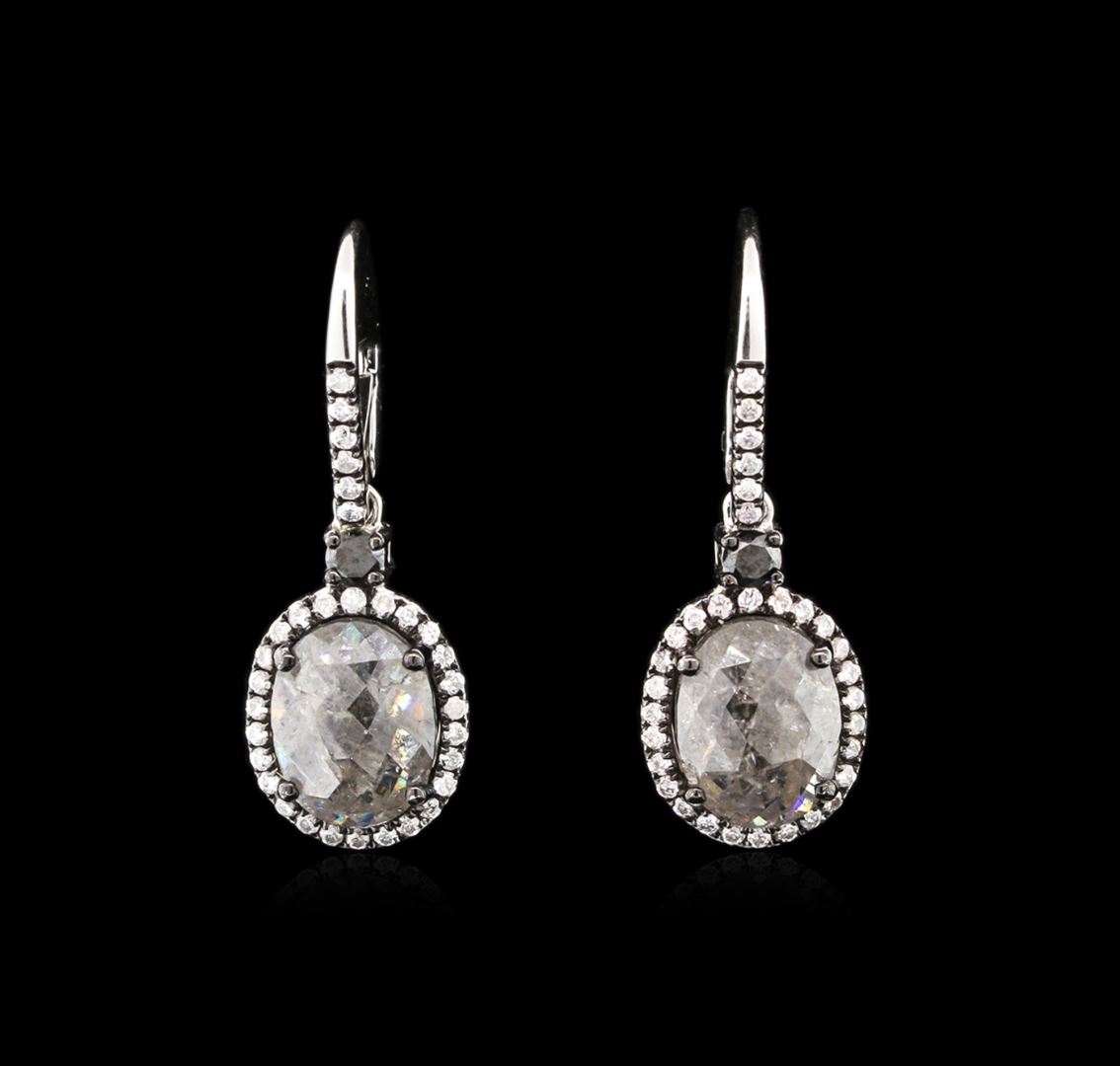 One pair electronically tested 18KT white gold ladies cast diamond earrings with lever backs with a bright polish finish. Trademark is MIdnight Star. Identified with markings of "18K". Condition is new. Containing: Two prong set rose cut diamonds, measuring 9.90 - 7.80 x 5.49mm (depth est.) approximate. Total Weight of 2 Stones = 3.70ct. Clarity: I-3, Color of Fancy Gray. Cut is Good. Two prong set round brilliant cut diamonds, measuring 2.50 - 2.50 x 1.50mm (depth est.) approximate. Total Weight of 2 Stones = 0.11ct. Color of Fancy Black. Cut is Good. Sixty-Four prong set round brilliant cut diamonds, measuring 1.00 - 1.00 x 0.60mm (depth est.) approximate. Total Weight of 64 Stones = 0.23ct. Clarity: I-1 to I-2. Color: I - J, Cut is Good. Diamonds are graded in the mounting, unless otherwise stated. Total Weight of Diamonds 3.93ct. Total Weight of Earrings 5.90 grams. GGL Appraised at $2,925.00.