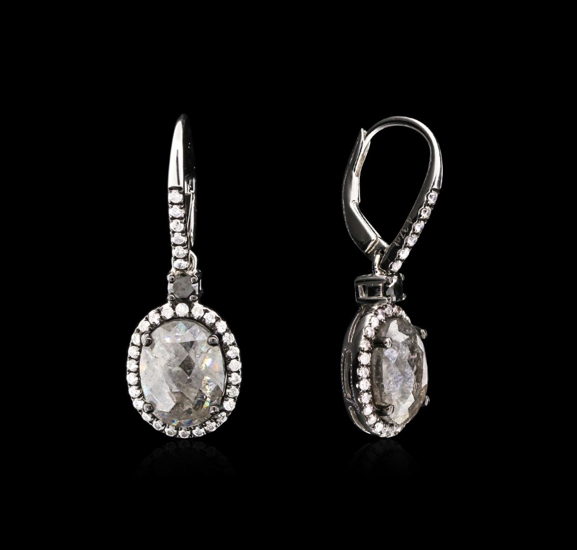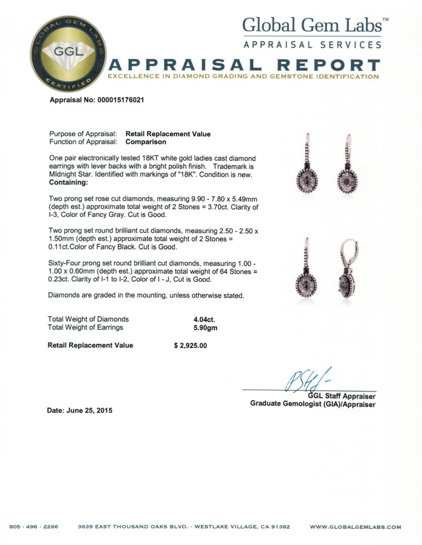 One pair electronically tested 18KT white gold ladies cast diamond earrings with lever backs with a bright polish finish. Trademark is MIdnight Star. Identified with markings of "18K". Condition is new. Containing: Two prong set rose cut diamonds, measuring 9.90 - 7.80 x 5.49mm (depth est.) approximate. Total Weight of 2 Stones = 3.70ct. Clarity: I-3, Color of Fancy Gray. Cut is Good. Two prong set round brilliant cut diamonds, measuring 2.50 - 2.50 x 1.50mm (depth est.) approximate. Total Weight of 2 Stones = 0.11ct. Color of Fancy Black. Cut is Good. Sixty-Four prong set round brilliant cut diamonds, measuring 1.00 - 1.00 x 0.60mm (depth est.) approximate. Total Weight of 64 Stones = 0.23ct. Clarity: I-1 to I-2. Color: I - J, Cut is Good. Diamonds are graded in the mounting, unless otherwise stated. Total Weight of Diamonds 3.93ct. Total Weight of Earrings 5.90 grams. GGL Appraised at $2,925.00.