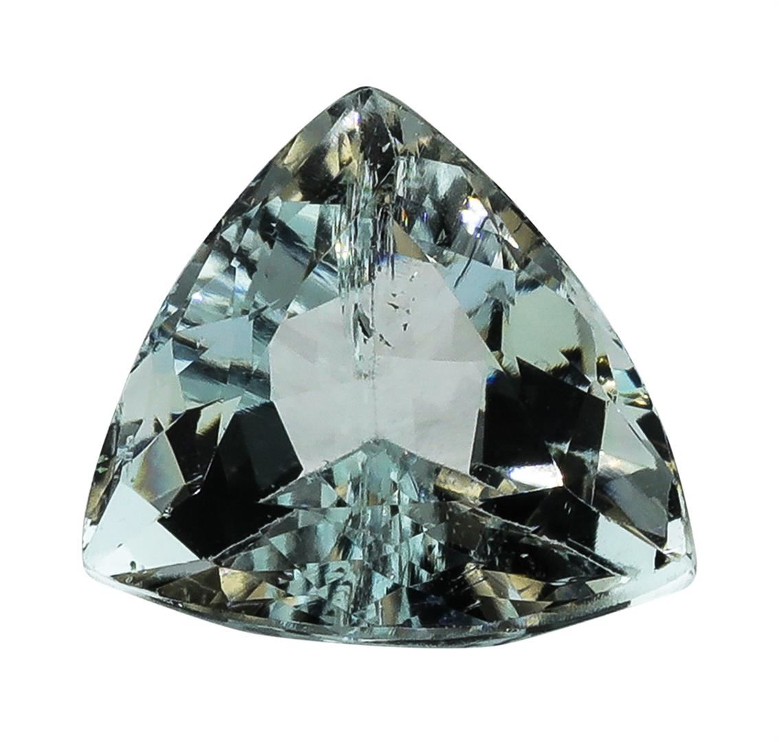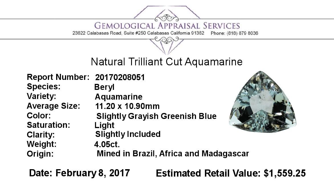 One natural trilliant cut aquamarine with an exact weight of 4.05ct., clarity is slightly included, slightly grayish greenish blue, light. Gemological Appraisals Services estimates the retail value at $1559.25 GAS Appraised.